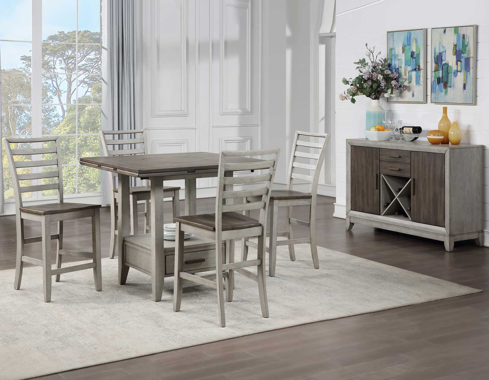 Casually styled and easy to live with, the Abacus Dropleaf Counter Dining Set features a great style with extra-special function. A smoky alabaster and putty two-tone finish presents a fashion-forward footprint that is enhanced by the Double Drop-Leaf Table that converts from a 42-inch square to a 59-inch round table just by lifting the leaves. The built-in lazy susan top makes serving a breeze and you will love the comfort and look of the Counter Chair for the collection. Add additional storage and serving area with the Abacus Server for the finest in casually styled dining!