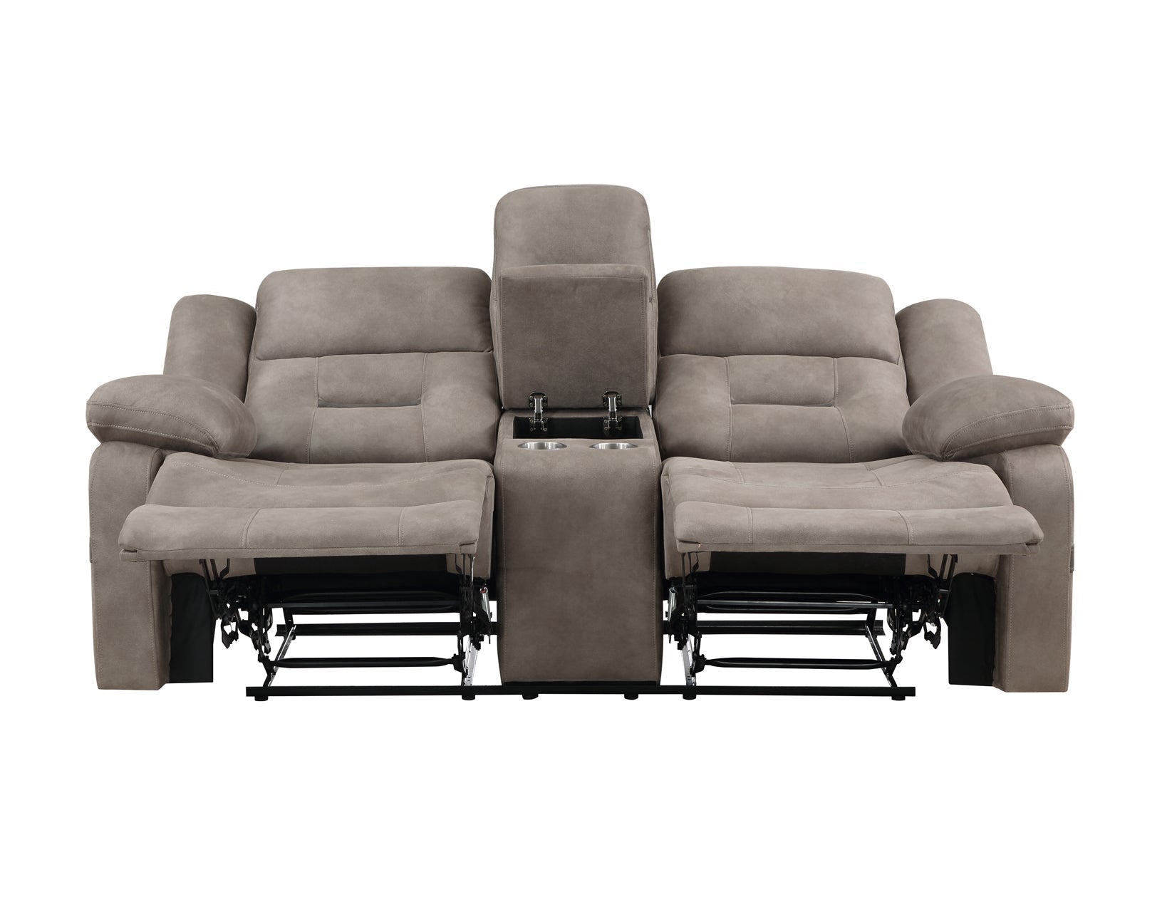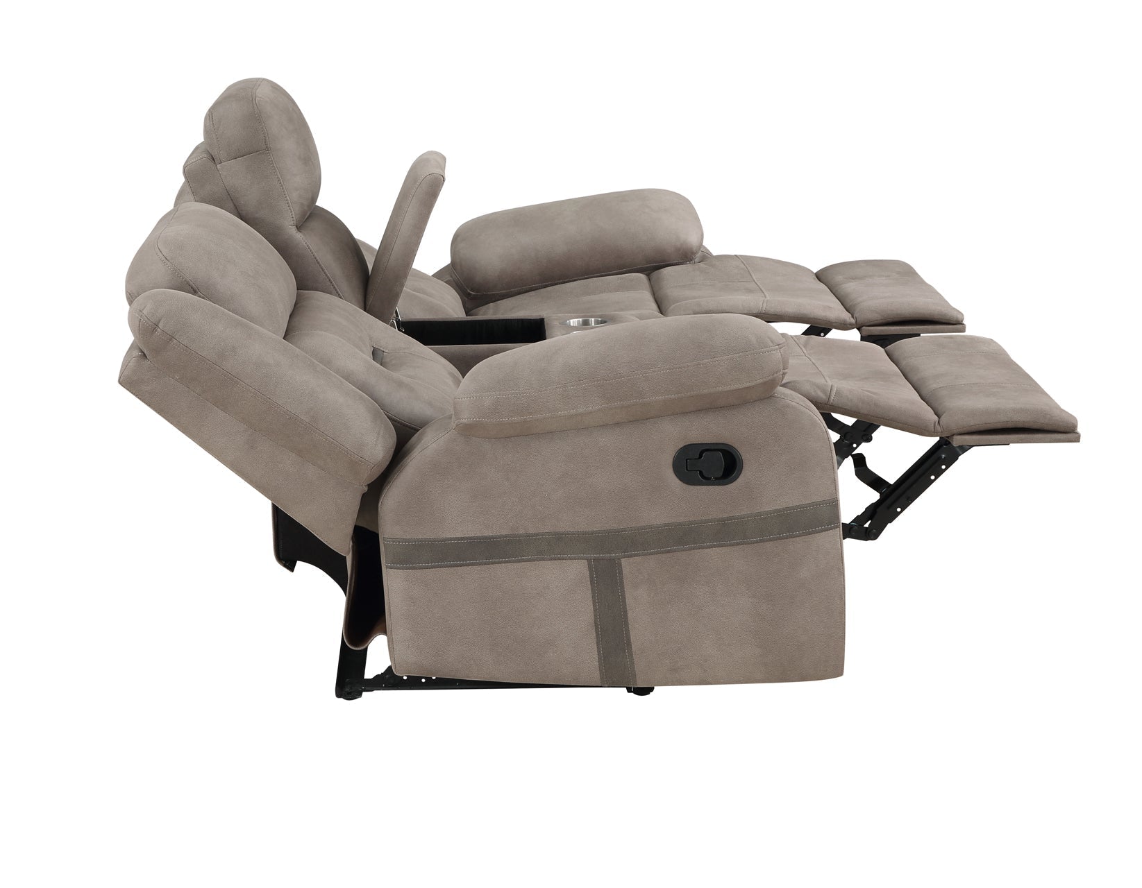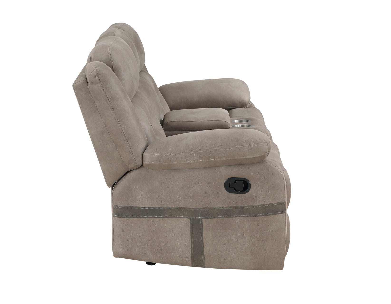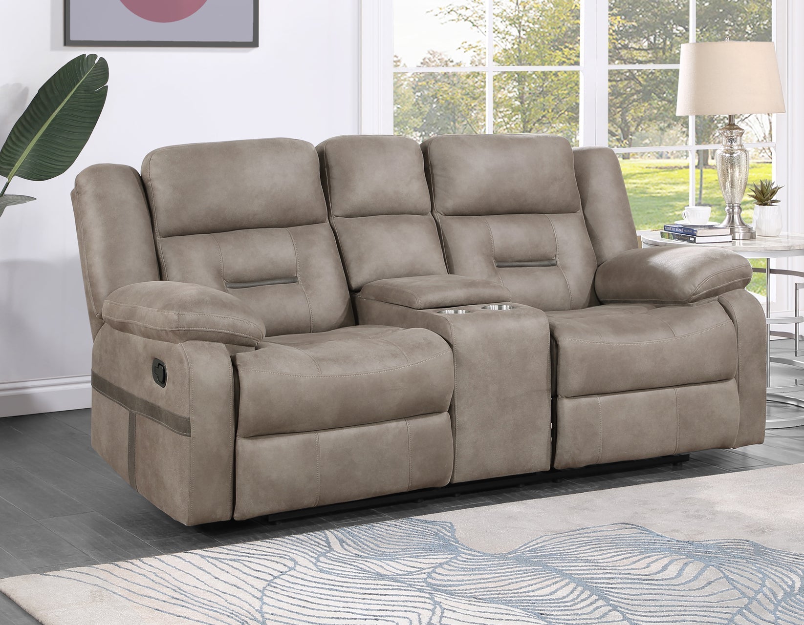Meet the Abilene, the ultimate addition to your living room! This manual reclining console loveseat has a lift-top console and two stainless steel cupholders to keep your essentials close at hand. With a tan leatherette cover and dark olive accents on side panels, the Abilene is both functional and stylish with overstuffed arms, shaped seats and a dimpled back for complete relaxation and lumbar support. Enjoy your favorite movie or book in ultimate comfort with the Abilene. Its sleek design complements any living space, making it a perfect addition to your home decor. Experience the best in comfort and functionality – choose the Abilene today!