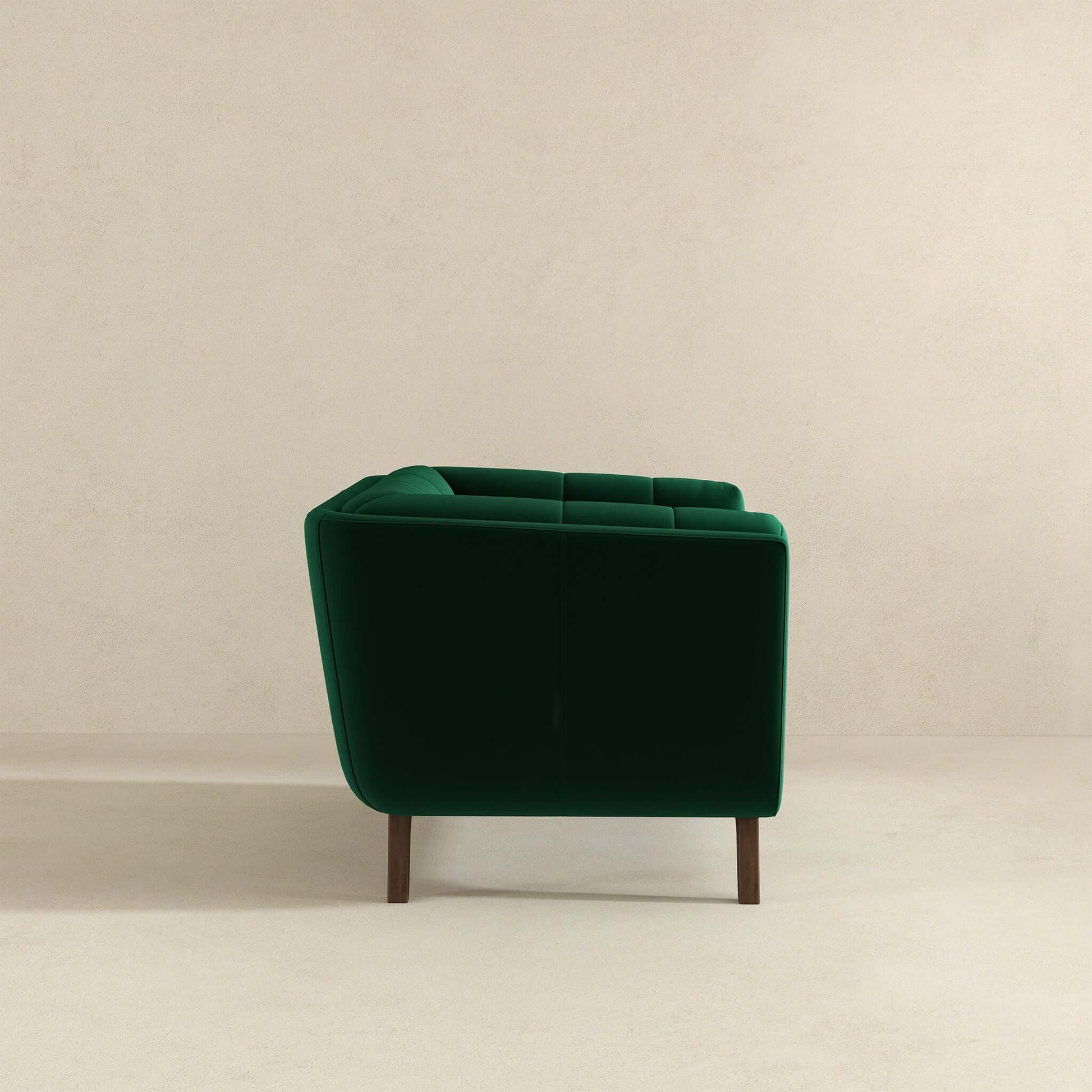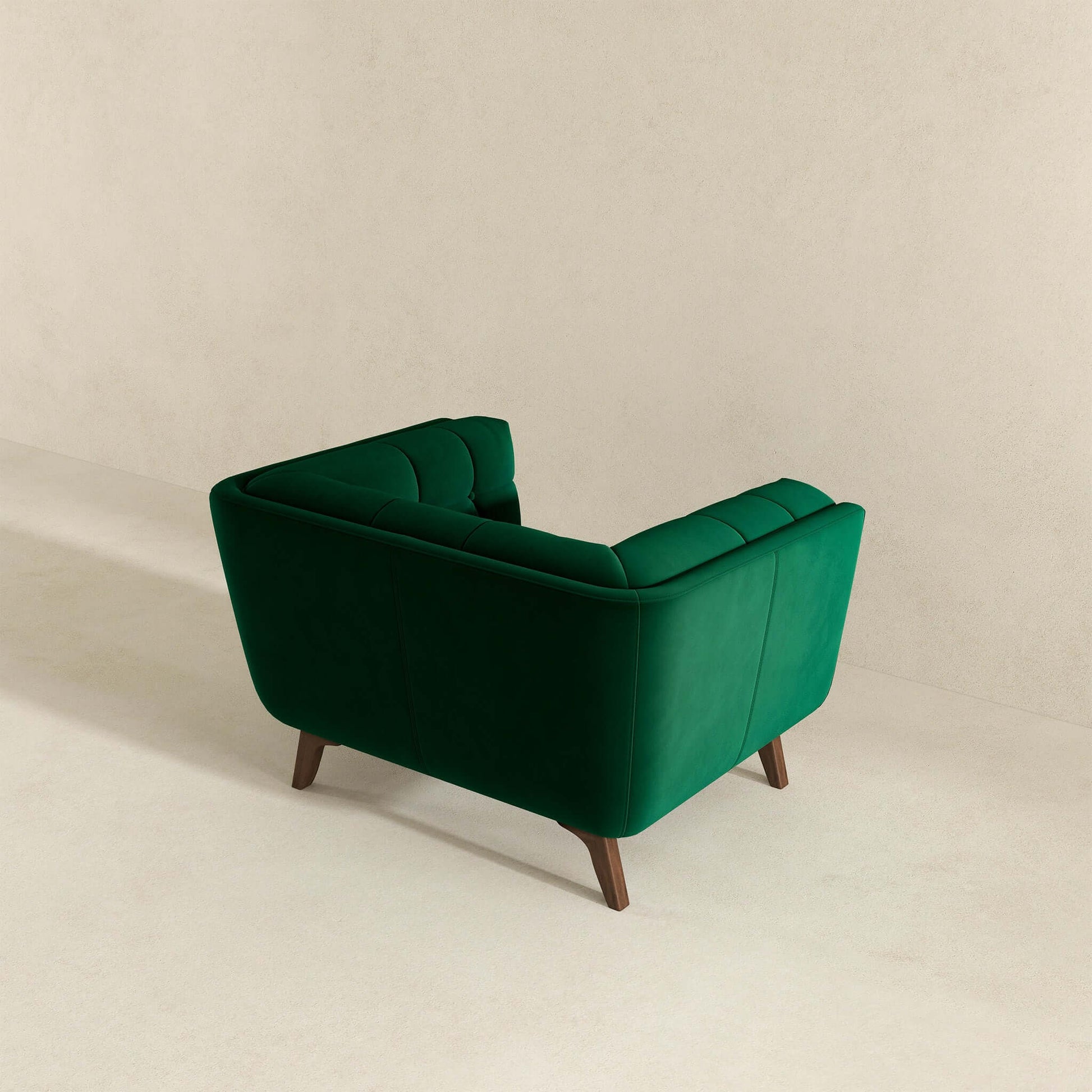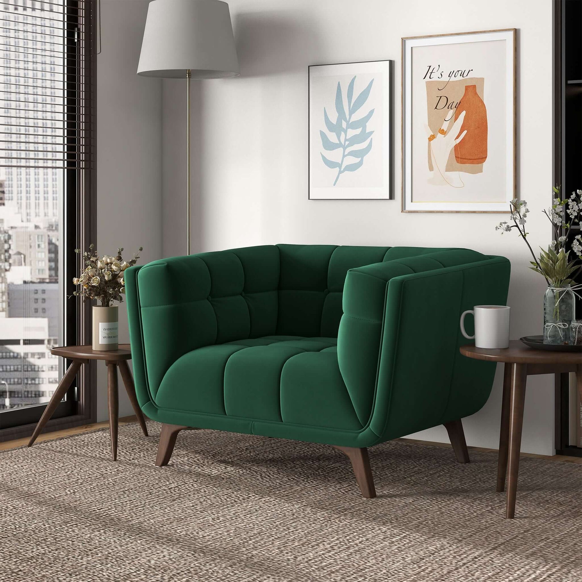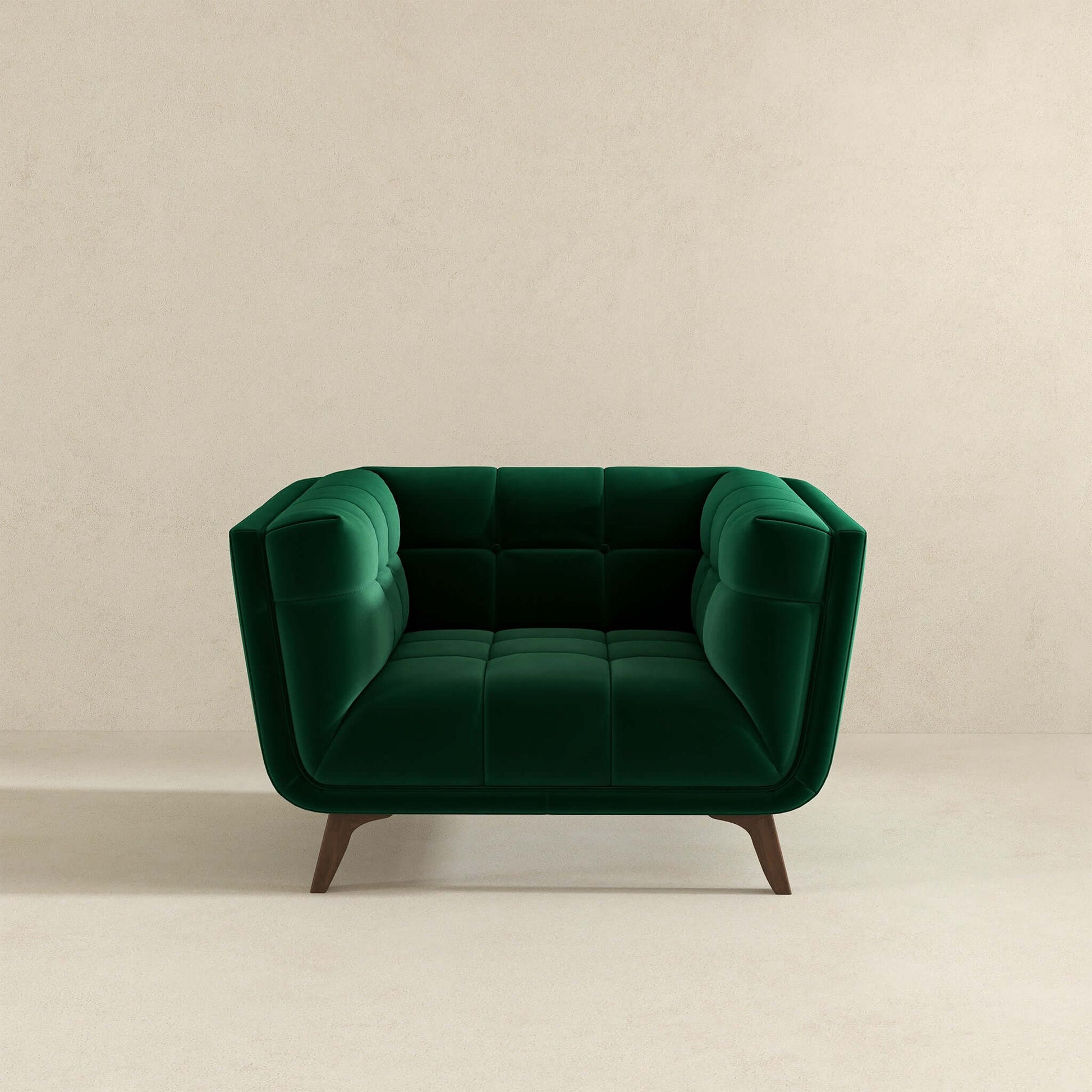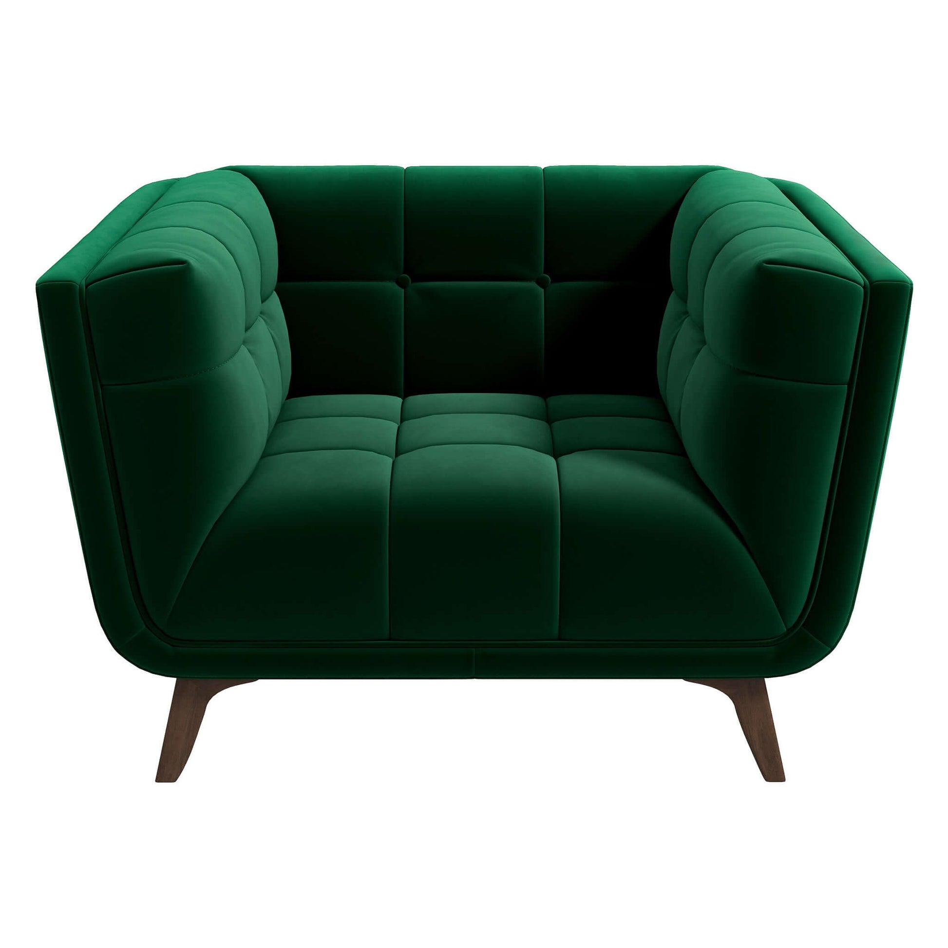 Our Addison Collection is for the maverick who wants to step outside the box. This collection is truly original and transitional. It features a smooth exterior and a plush tufted interior. Due to the leather's natural characteristics, texture, and color may vary. Sitting on mid-century modern walnut legs and features obtusely angled sides.