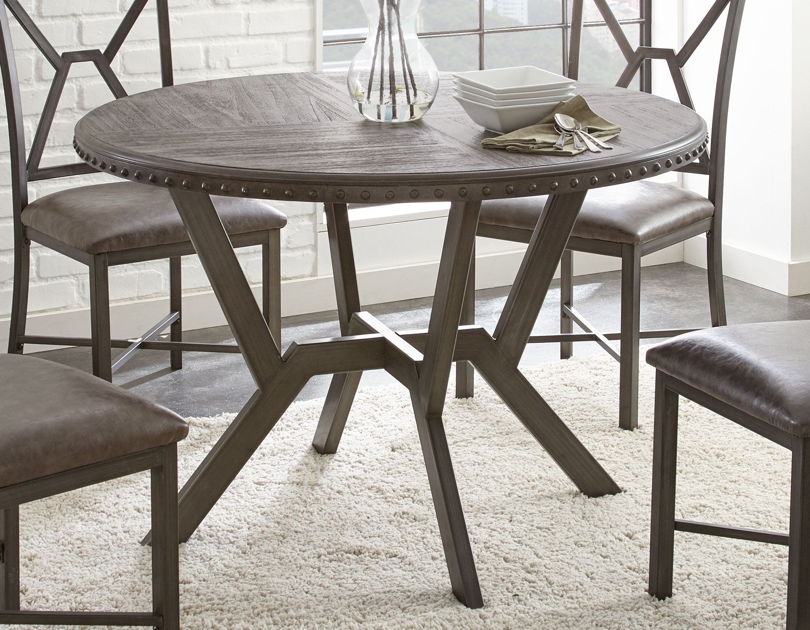 Alamo brings an updated design to the industrial look in this round mixed media dining set. A cool neutral gray finish marries the wood and metal in a set that can be accessorized to fit your home perfectly. Side chairs have an inverted hexagonal metal back with wood top-rail and are upholstered so your sense of style will not impair your comfort. The rivet look metal-rimmed top sports a parquet veneer that is casual and interesting to look while enjoying your meal.