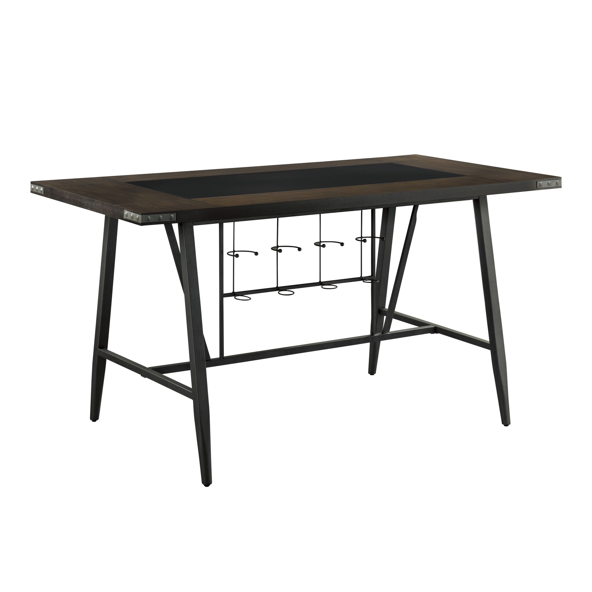 Perfectly styled for your casual dining room is the Appert Collection. This counter height offering features a dark gray metal base with built in wine rack that serves to support the wood top which frames a black rectangular glass insert. The round seats and back supports of the accompanying chairs are covered in black bi-cast vinyl.