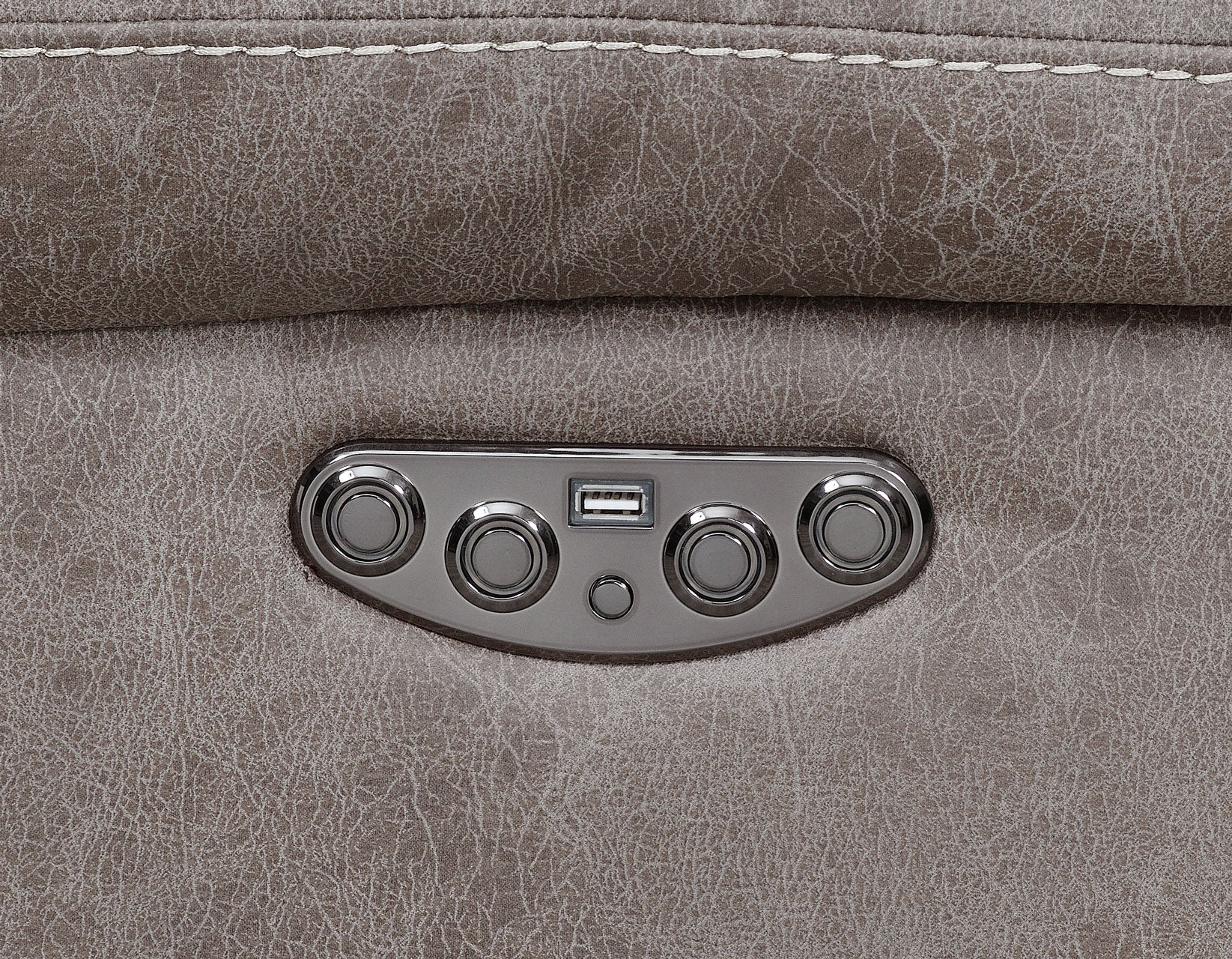 The ultimate in reclining comfort, Aria has power functions built throughout. Shown in desert sand colored fabric material, the sectional offers power footrest and power articulating headrest so you never have to sacrifice comfort to watch your favorite shows. The power control panel features a USB port for recharging devices and a home button to return each recliner to its original position.