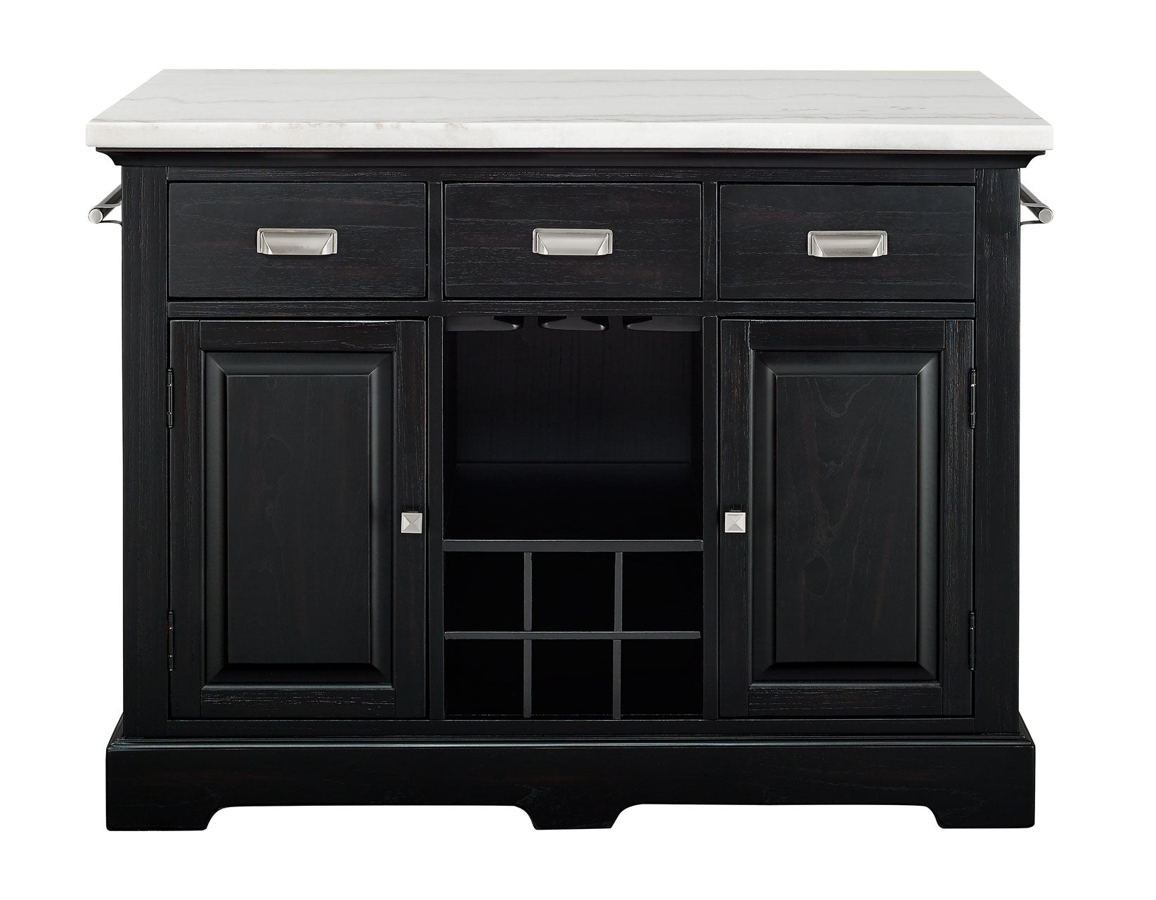 As comfortable in a French bistro as it is in your own kitchen, the Aspen Kitchen Island has vintage styling with a modern edge. This beauty is bound to become your kitchen hub with it beautiful long-lasting white marble top and shelf that can accommodate the matching nailhead trim counter stools. The pewter cup hardware and towel rack accent the wine rack and storage you are sure to love!