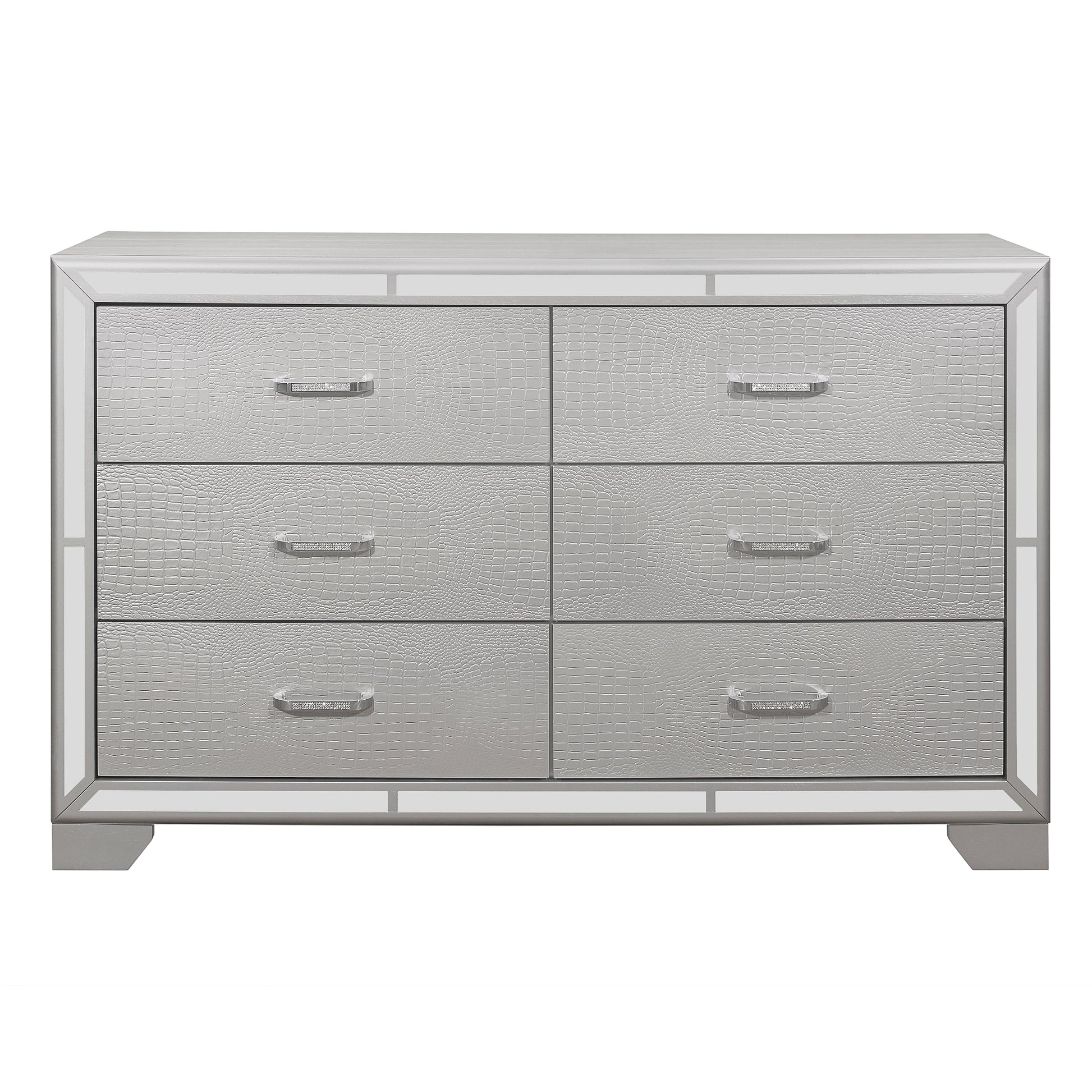 Elegant touches abound with the design of the Aveline Collection. Alligator embossed veneer covers the collection and is finished in silver, an elegant palette that beautifully pairs with your bedroom’s accessories. The dresser is framed with mirror trim, while the drawers are fronted with chrome-finished faux-crystal inlay bar hardware, each accent a perfect decorative touch to reflect your glamorous style.