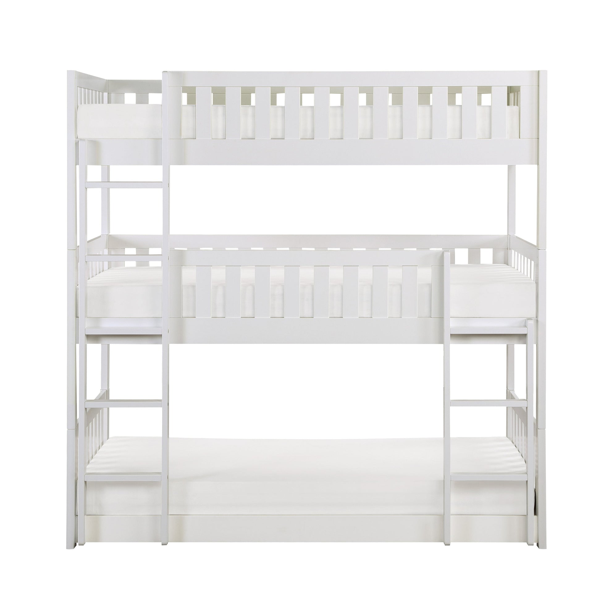 Maximizing sleep space is achieved with the stylish Galen Collection. This transitional triple twin bunkbed is featured in a white finish making it an appropriate choice for a number of youth bedroom settings. The three sleep platforms start at floor level and work their way up via an attached ladder system.