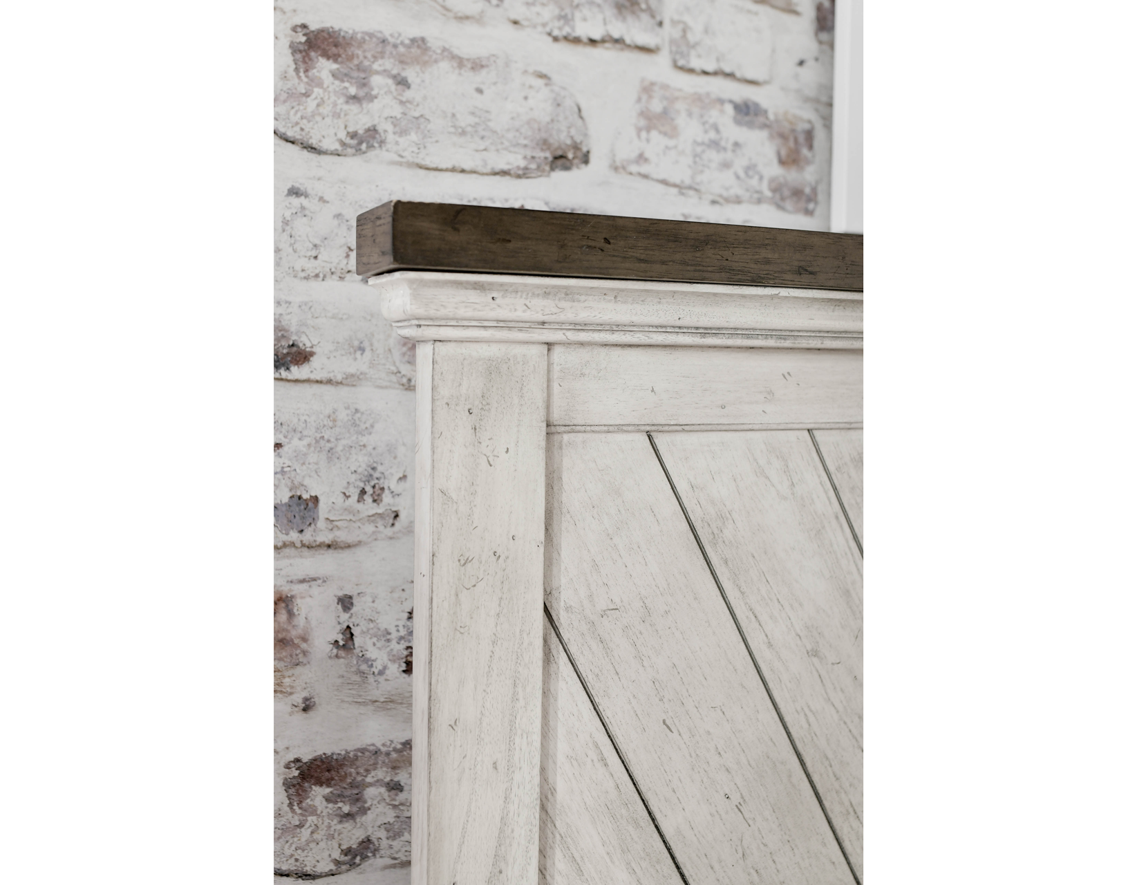 A rustic, farmhouse-inspired bedroom, Bear Creek features a white-smoke finish that contrasts beautifully with honey-smoke stained tops and cap rails. The chevron patterned headboard and footboard is offered in King and Queen sizes and the bedroom collection offers a variety of storage items with ultra-deep drawers supported by side drawer glides for easy operation.