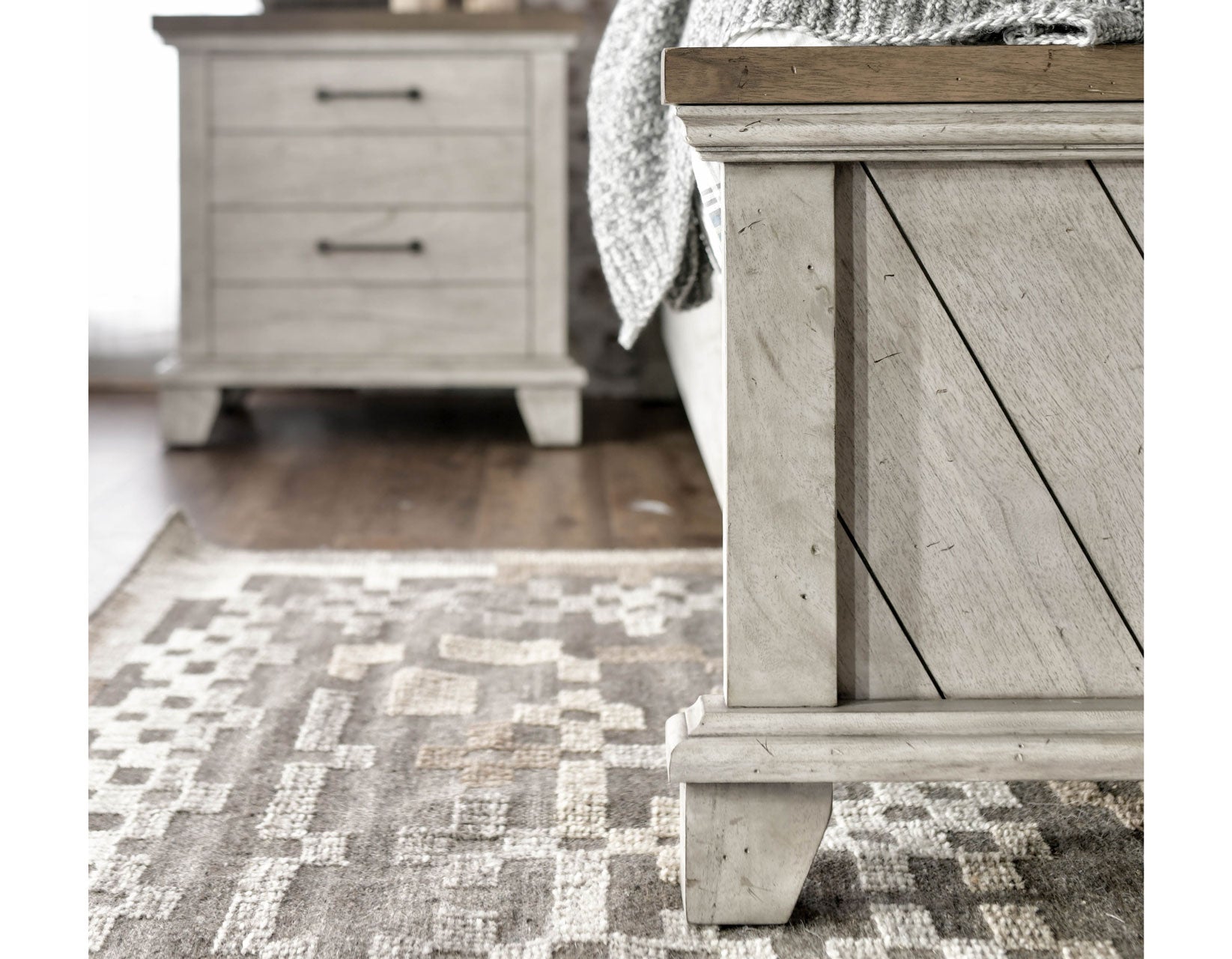 A rustic, farmhouse-inspired bed, Bear Creek features a white-smoke finish that contrasts beautifully with honey-smoke stained tops and cap rails. The chevron patterned headboard and footboard is offered in King and Queen sizes and the bedroom collection offers a variety of storage items with ultra-deep drawers supported by side drawer glides for easy operation.
