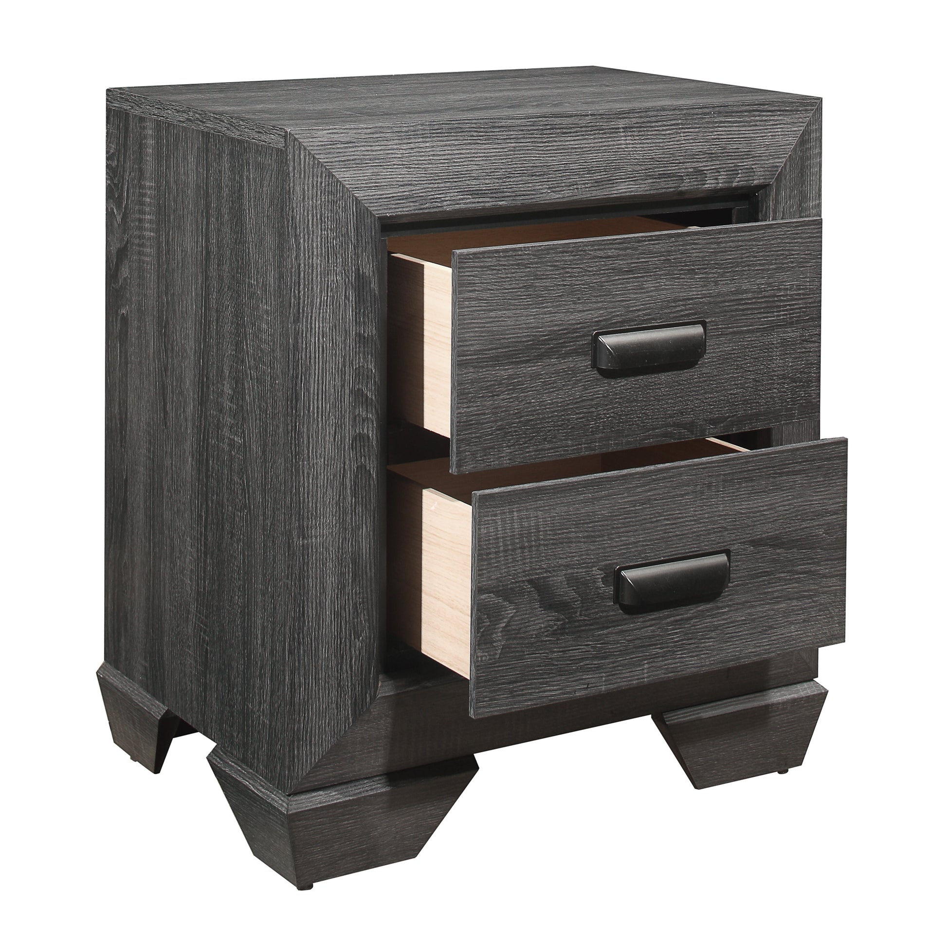 Blending the elements of contemporary design and rustic aesthetic, the Beechnut Collection is a unique addition to your bedroom. Dark under-paneling serves to highlight the gray finish enhancing the embossed faux-wood veneer of the nightstand's drawer fronts. Contrasting cup hardware punctuates each drawer front.