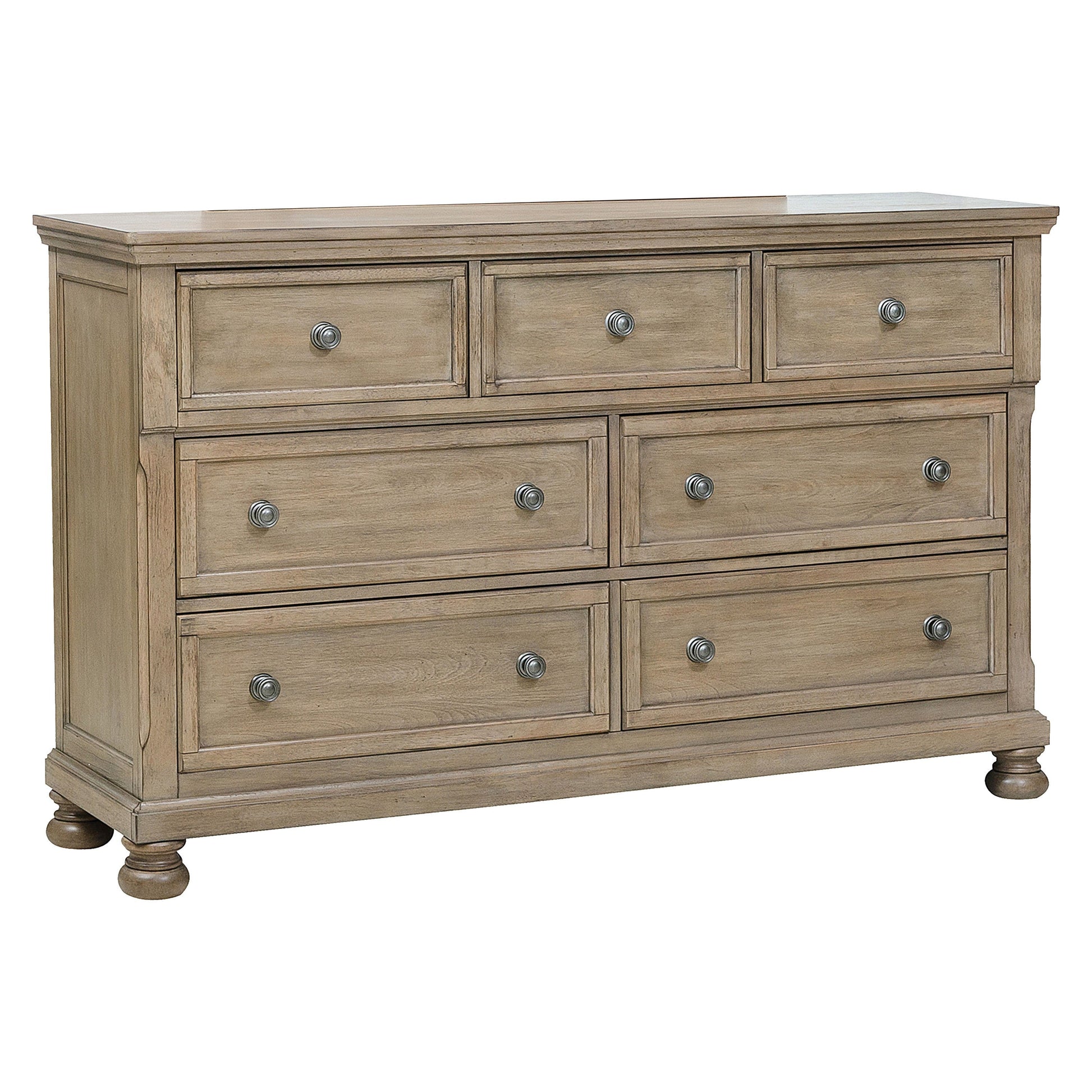 An updated classic addition for your transitional bedroom is the Bethel Collection. Traditional accents, such as turned bun feet support the dresser, and a gray, lightly wire-brushed finish on birch veneer and selected hardwoods, blends with framing and lines that complement your personal style. Hidden drawer storage in the dresser is a clever way to hide your valuables. Coordinating Queen bed, Eastern King, California King bed, mirror, nightstand and chest are also available, as well as an antique white finish option.