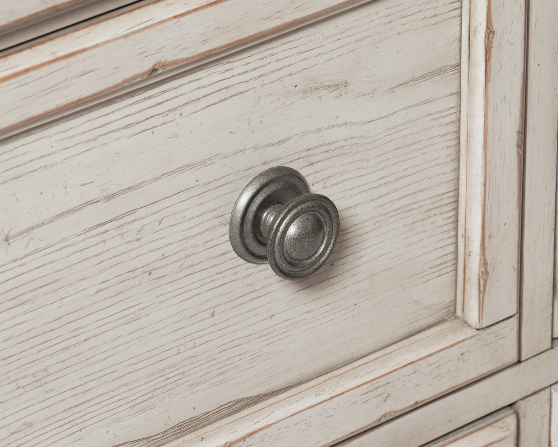 An updated classic addition for your transitional bedroom is the Bethel Collection. Traditional accents, such as turned bun feet support the dresser, and an antique white, lightly wire-brushed finish on ash veneer and selected hardwoods, blends with framing and lines that complement your personal style. Hidden drawer storage in the dresser is a clever way to hide your valuables. Coordinating queen bed, eastern king, California king bed, mirror, nightstand and chest are also available, as well as a gray finish option.