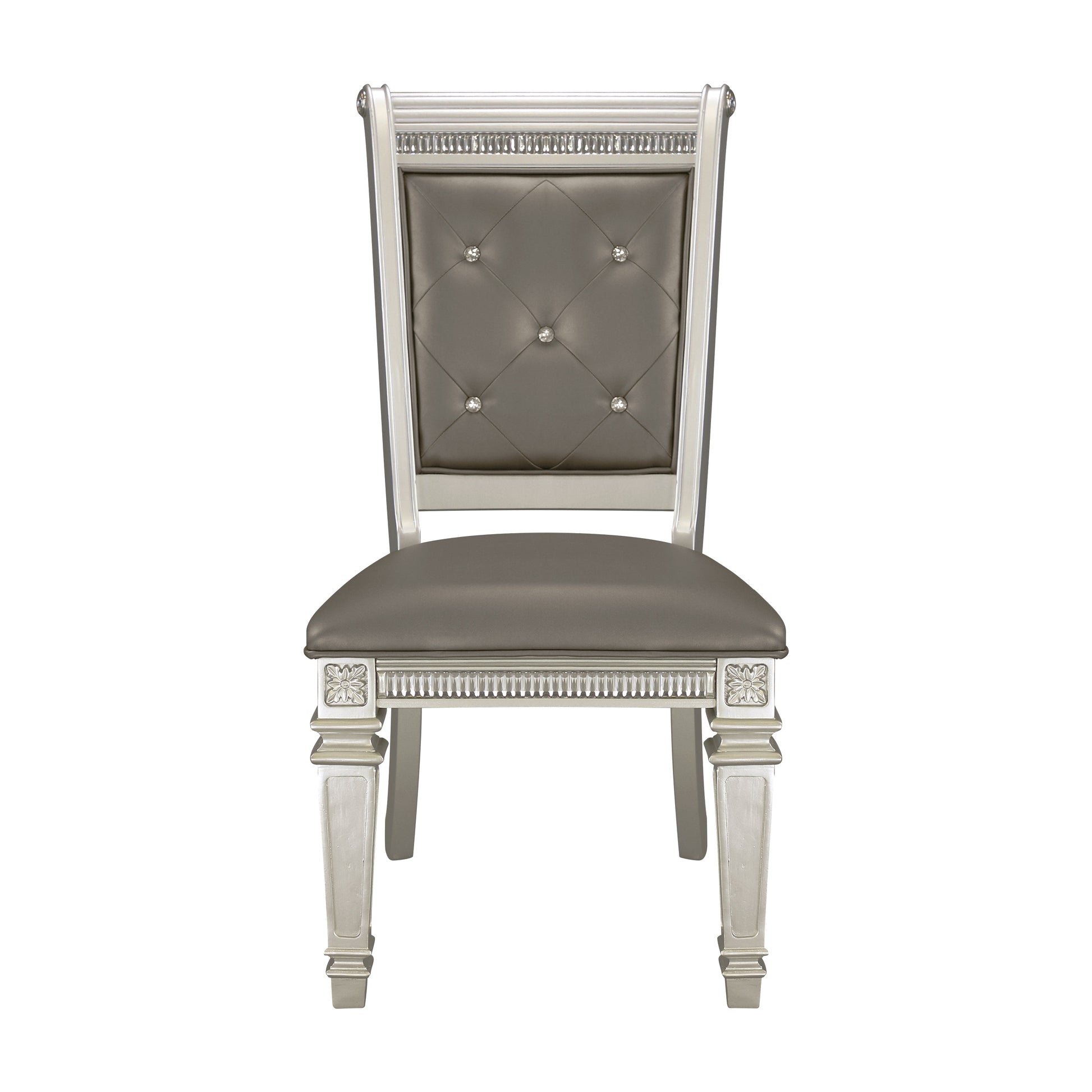 Modern glamour is exemplified in the design of the Bevelle Collection. The dark gray faux leather of the side chairs provides contrast to the coordinating silver finish dining table.