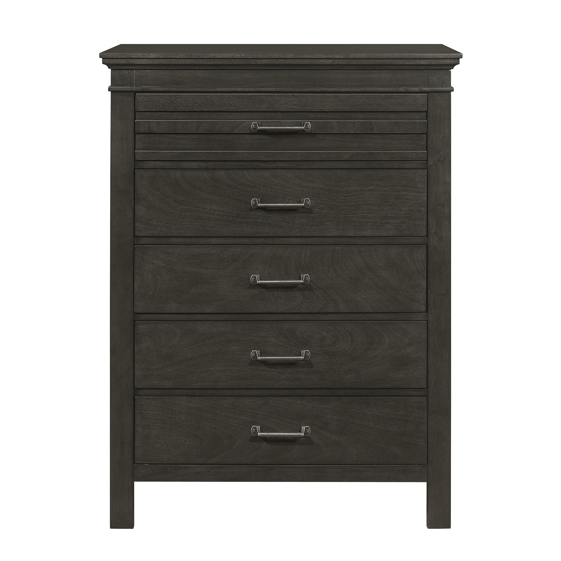 The transitional styling of the Blaire Farm Collection serves as the perfect complement to the rustic aesthetic that inspired the design. The okume veneer is enhanced by the charcoal gray finish that covers the chest. Fixed handle pull hardware fronts the drawers while horizontal accent on the top drawer lends visual contrast.