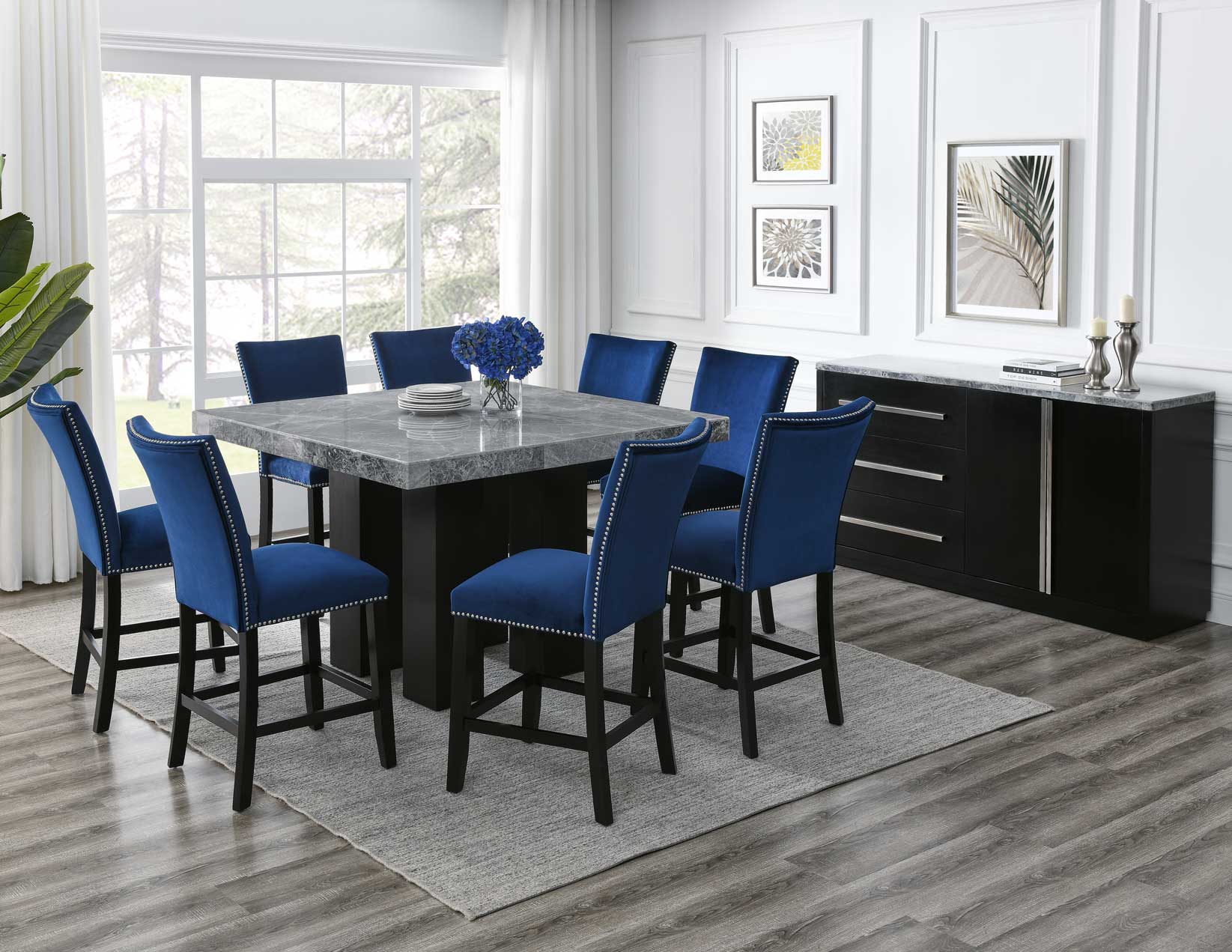 Elegant dining with a modern twist, Camila offers beautiful white marble counter dining with a choice of three counter chair options – silver or black easy-care polyurethane or an upscale blue velvet look. All chairs feature stretchers and nailhead trim to dress up any dining area. The dining collection is available in rectangular or square marble dining tops.