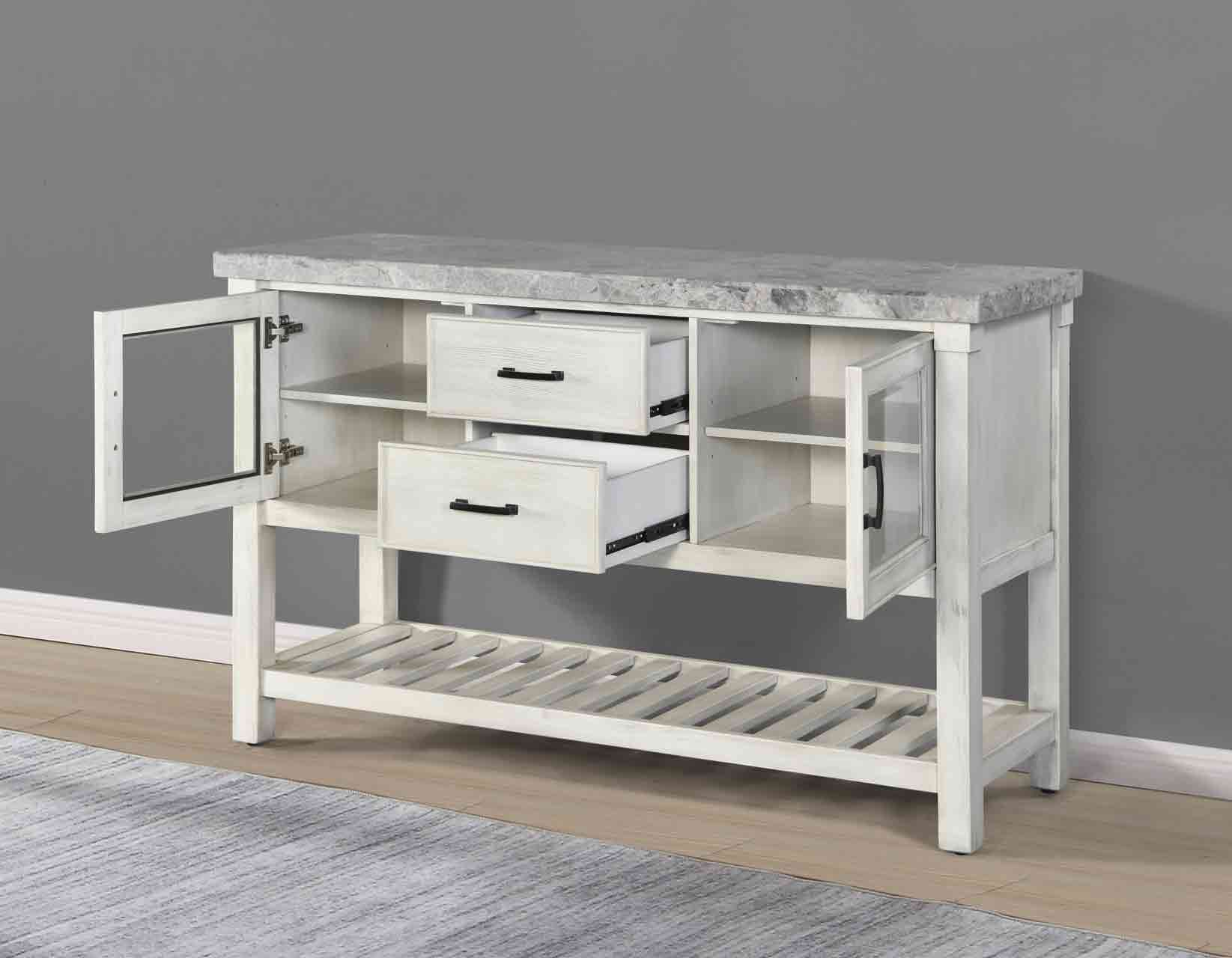 A casually elegant Server in a neutral palette, Canova fits the bill as a dining companion piece. A Cathedral White wood finish pairs beautifully with the solid gray marble veneer in a piece that can be used in classic, contemporary or farmhouse decors. Glass doors allow for a display area or can be used for electronics and remotes in an entertainment package.