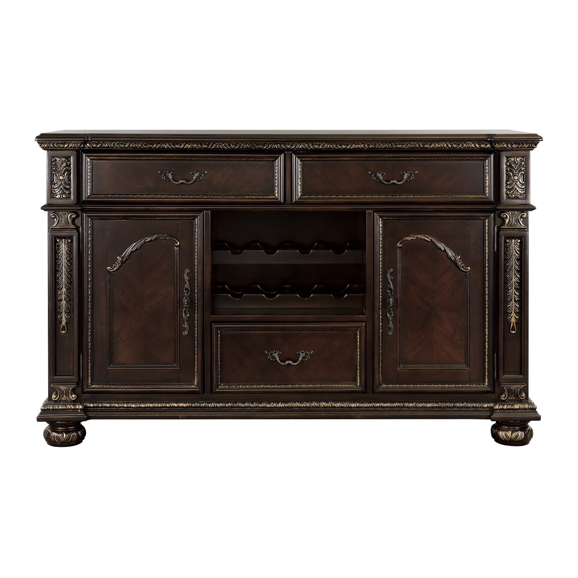 Old-World European styling is captured in the dramatically elegant Catalonia Collection. Traditional design elements reign at every turn – egg and dart molding, acanthus leaf carving, bead molding, gold tipping and extravagant carvings – creating a sophisticated look for your dining room. Each drawer front of the server features dark bronze fixed-drop hardware with decorative flourish that furthers the elegant appointments.