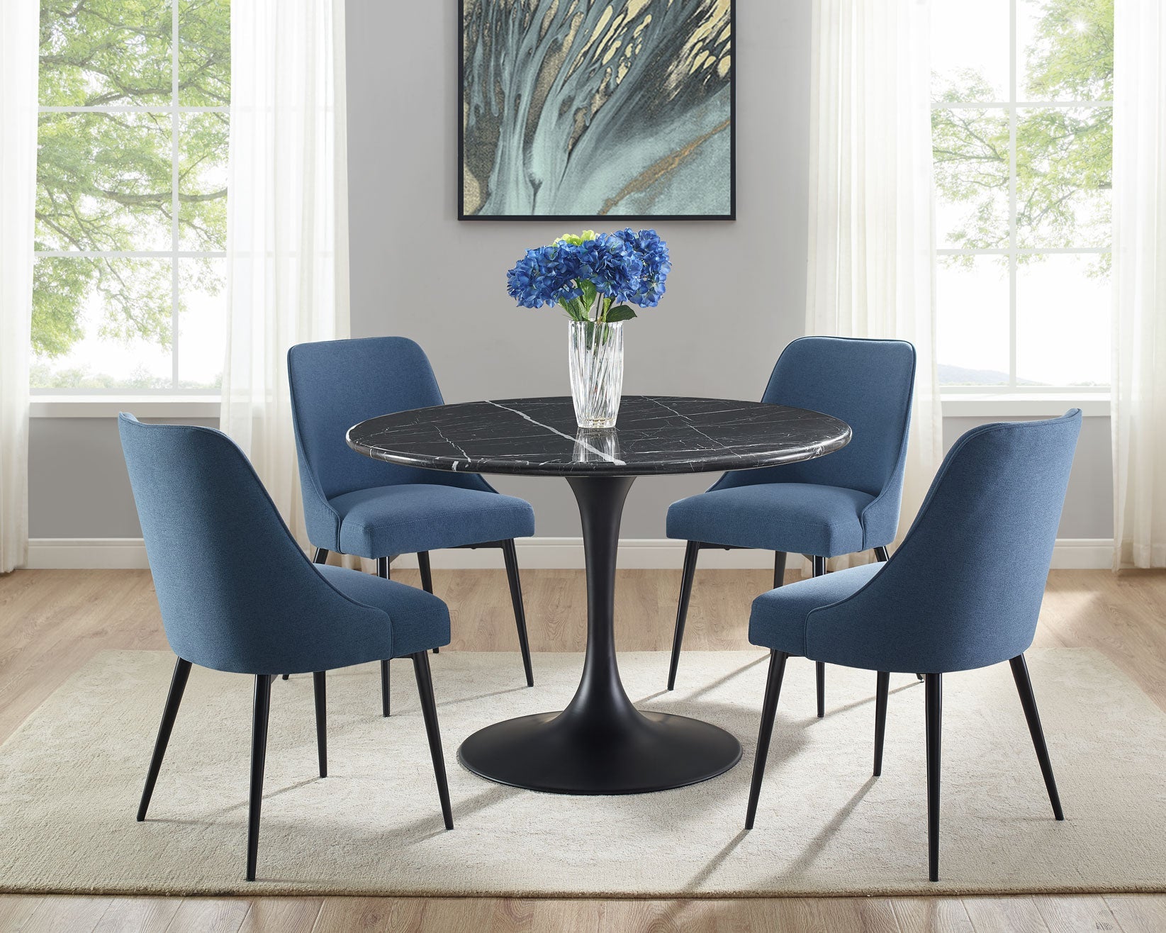 Mid-century modern design in an elegant marble dining collection, that’s Colfax from Steve Silver Company. The black Marquina marble top table has beautiful white veining for a sophisticated black & white complement to any contemporary decor. The upholstered side chair is comfortable and fashion-forward with canted metal legs and is shown in navy fabric.