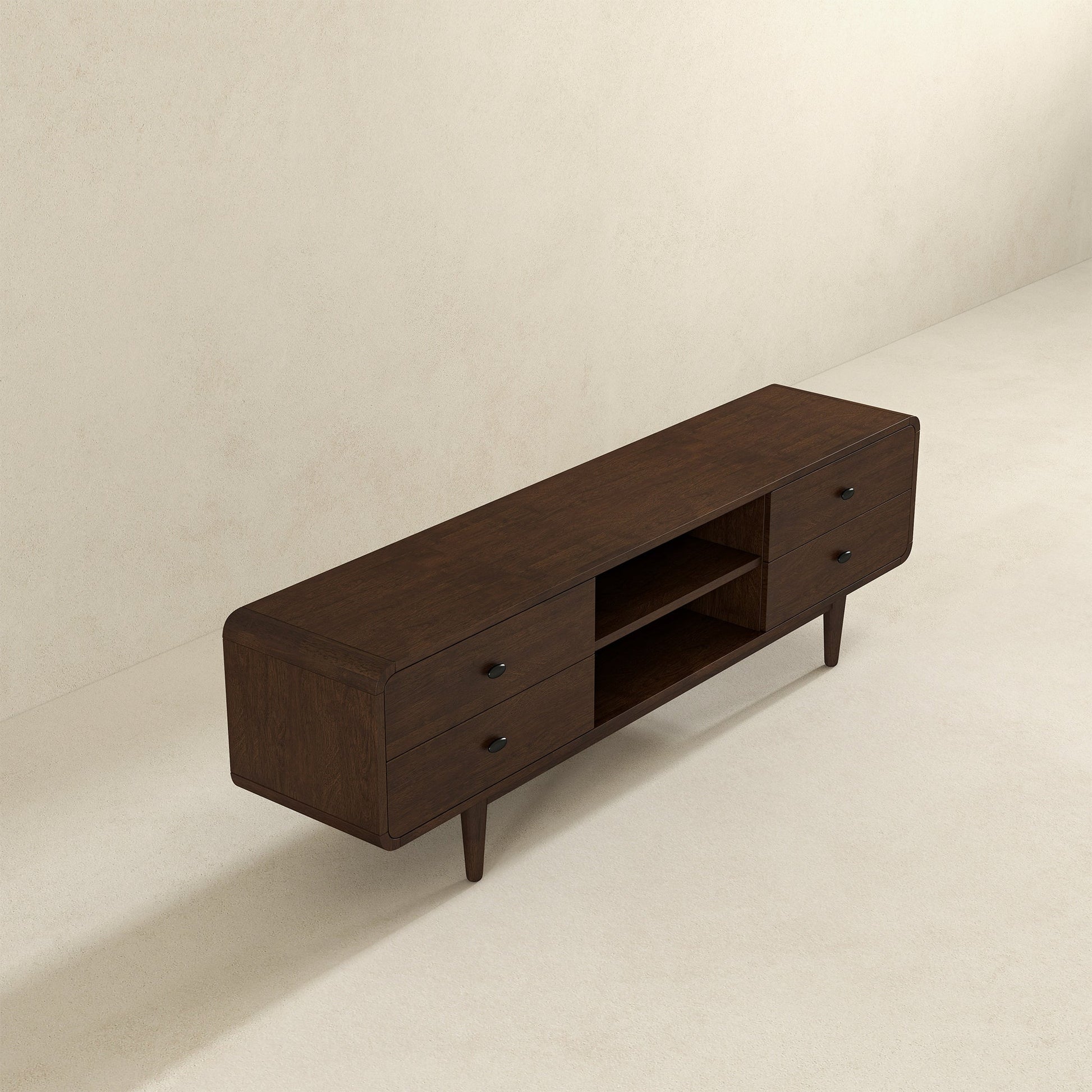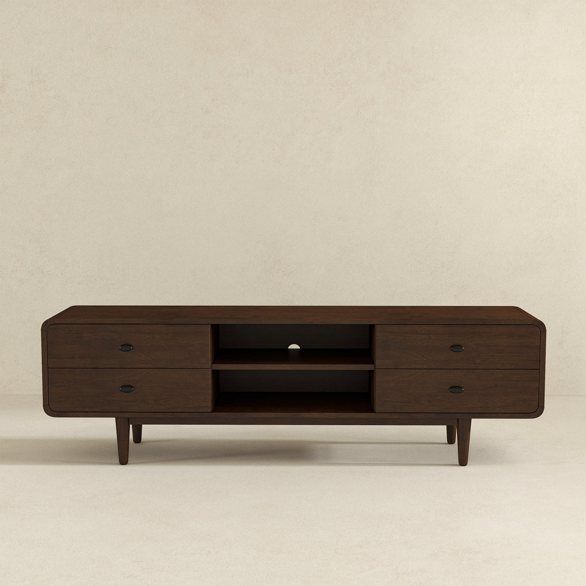 Give your entertainment space some added appeal with this mid-century modern low-profile TV Stand to transform your living space with retro modern intrigue. This extra-quality media console table is a perfect addition to any recreation area, entertainment center, living room, bedroom, game room, office, and media room. Modern designed Tv stand accommodates flat screen TVs up to 72. This tv stand with a storage unit for the living room features a combination of functional shelves and drawers, while cable management holes keep living spaces clean and tidy.
