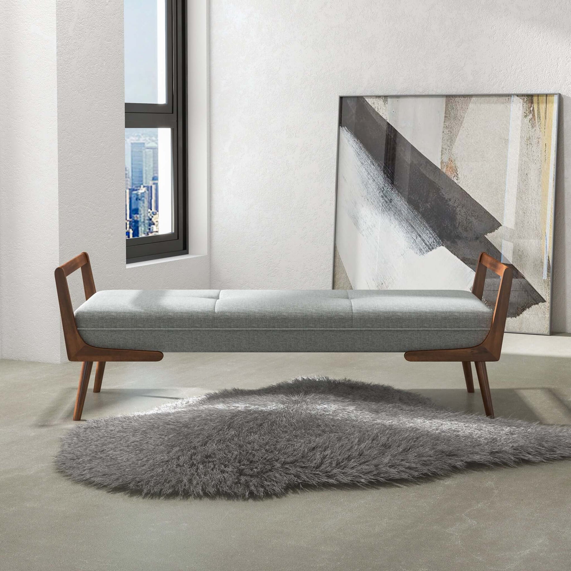 The Cora upholstered bench is gorgeously adaptable, a Mid-Century modern update to a retro classic. Its seat cushion is crafted of high-quality Fabric and filled with high-density foam providing comfortable sitting for up to 3. This Dark Grey accent bench is constructed of a sturdy solid wood frame and boasts tapered solid wood legs in a rich finish to convey a refined aesthetic with a hint of mid-century flair. Can be cleaned with a non-abrasive cleaning solution followed by a quick microfiber cloth. Removable legs allow for simple delivery for tight spaces. Available in a variety of timeless colors, you're sure to find something that matches your decor. PARTIAL ASSEMBLY REQUIRED