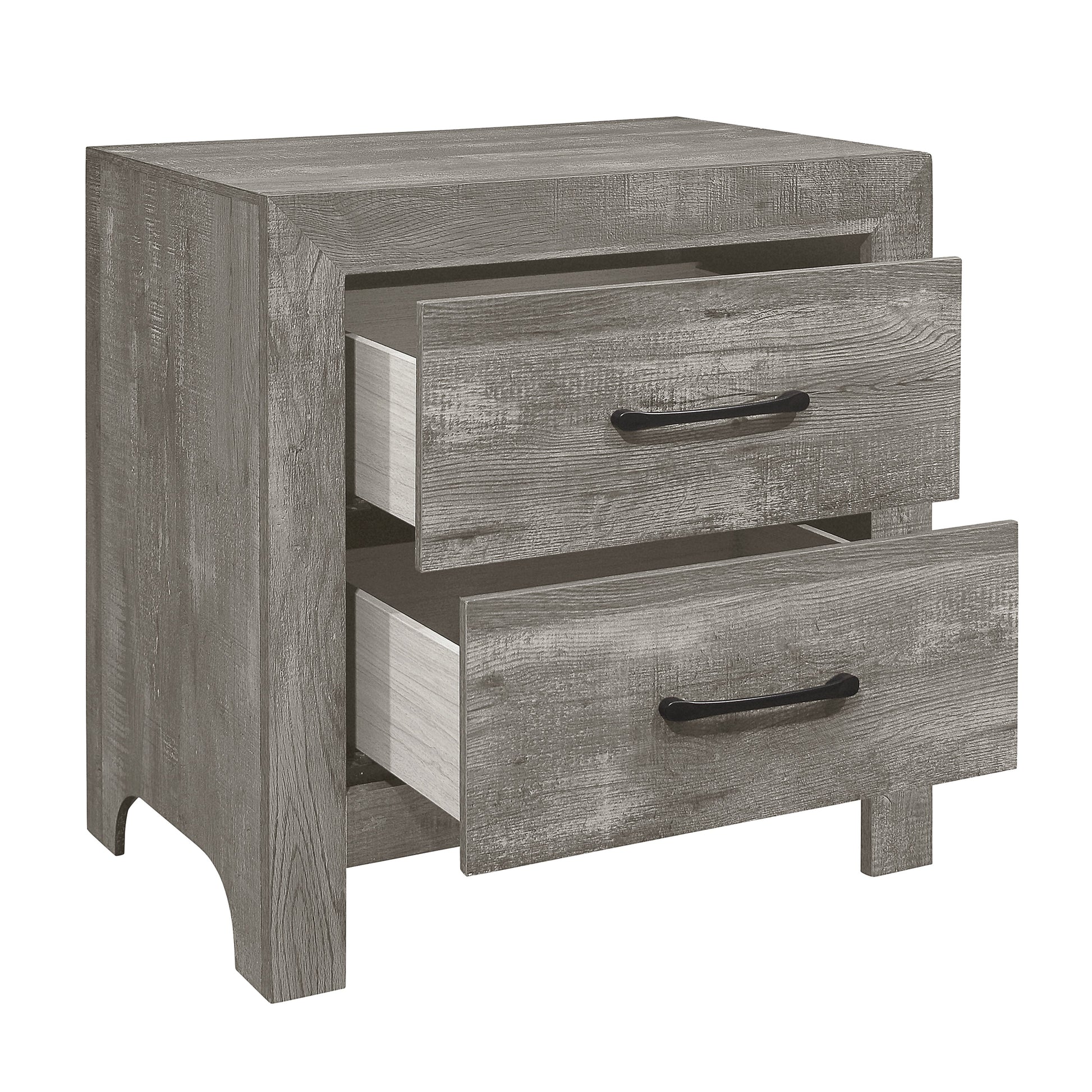 Modern lines and rustic styling are paired to create the look of the Corbin Collection. The 3D printed paper veneer’s texture is highlighted by a gray finish for a realistic wood look. Providing complementing contrast, the drawer fronts of the nightstand feature black metal hardware. Subtle framing defines the profile of the dresser, further lending to the unfettered design of the collection.