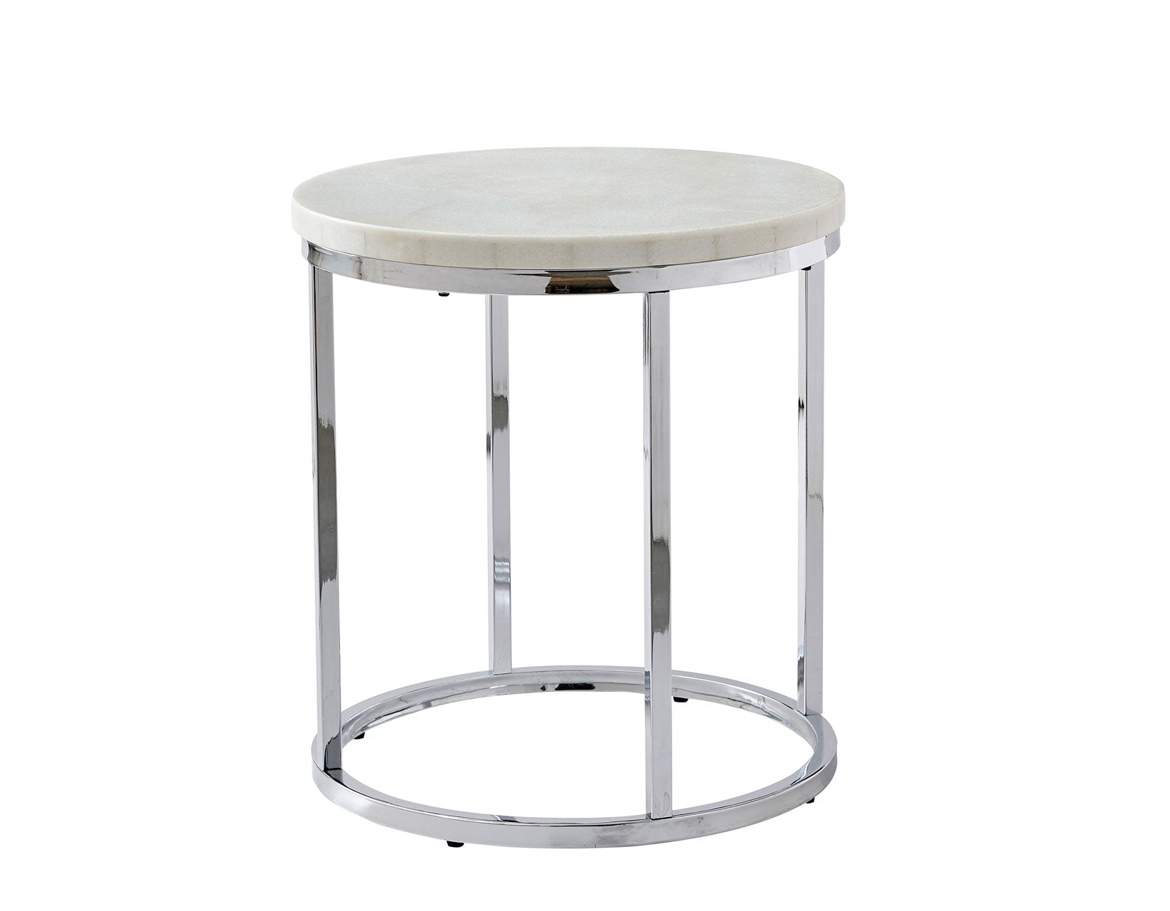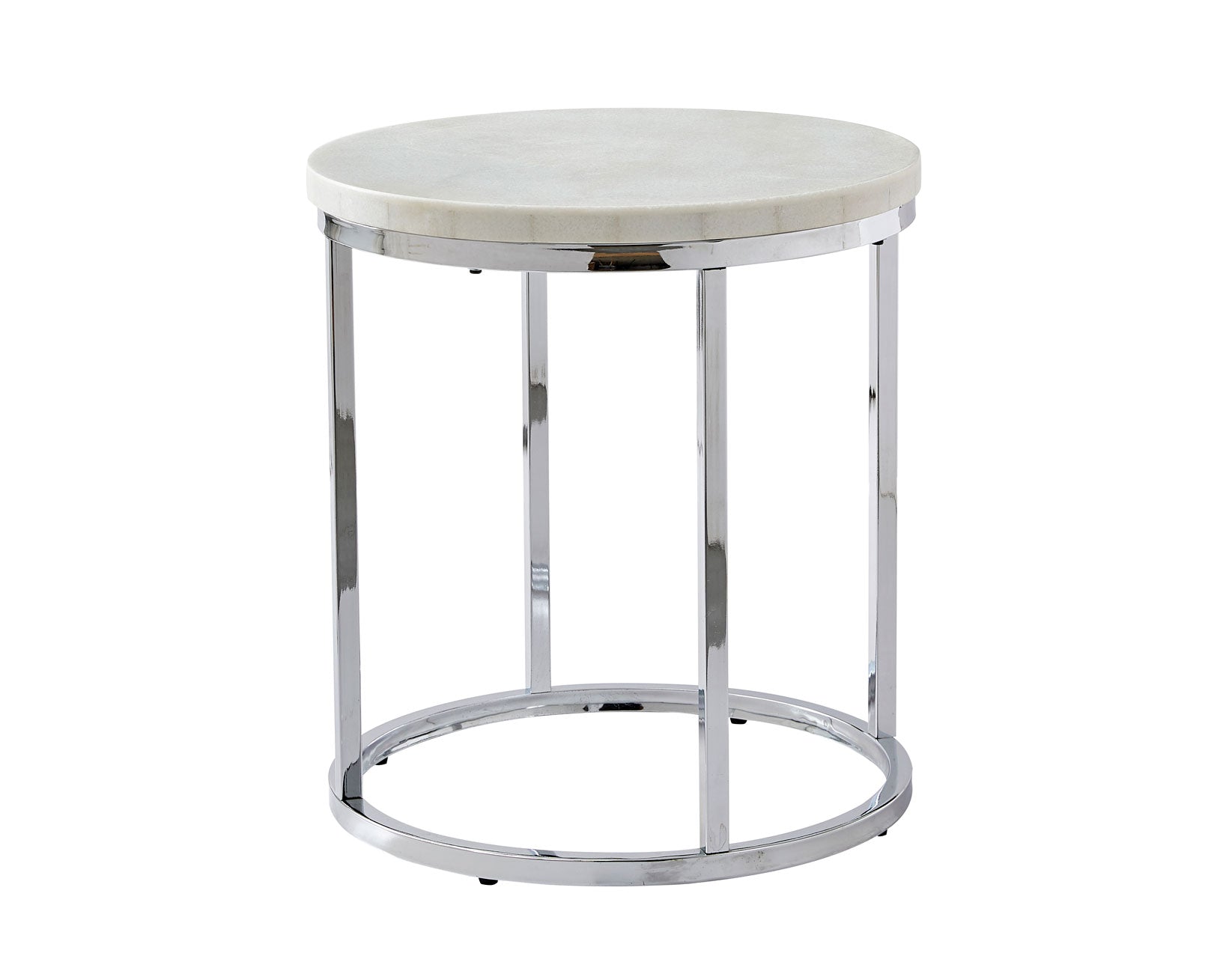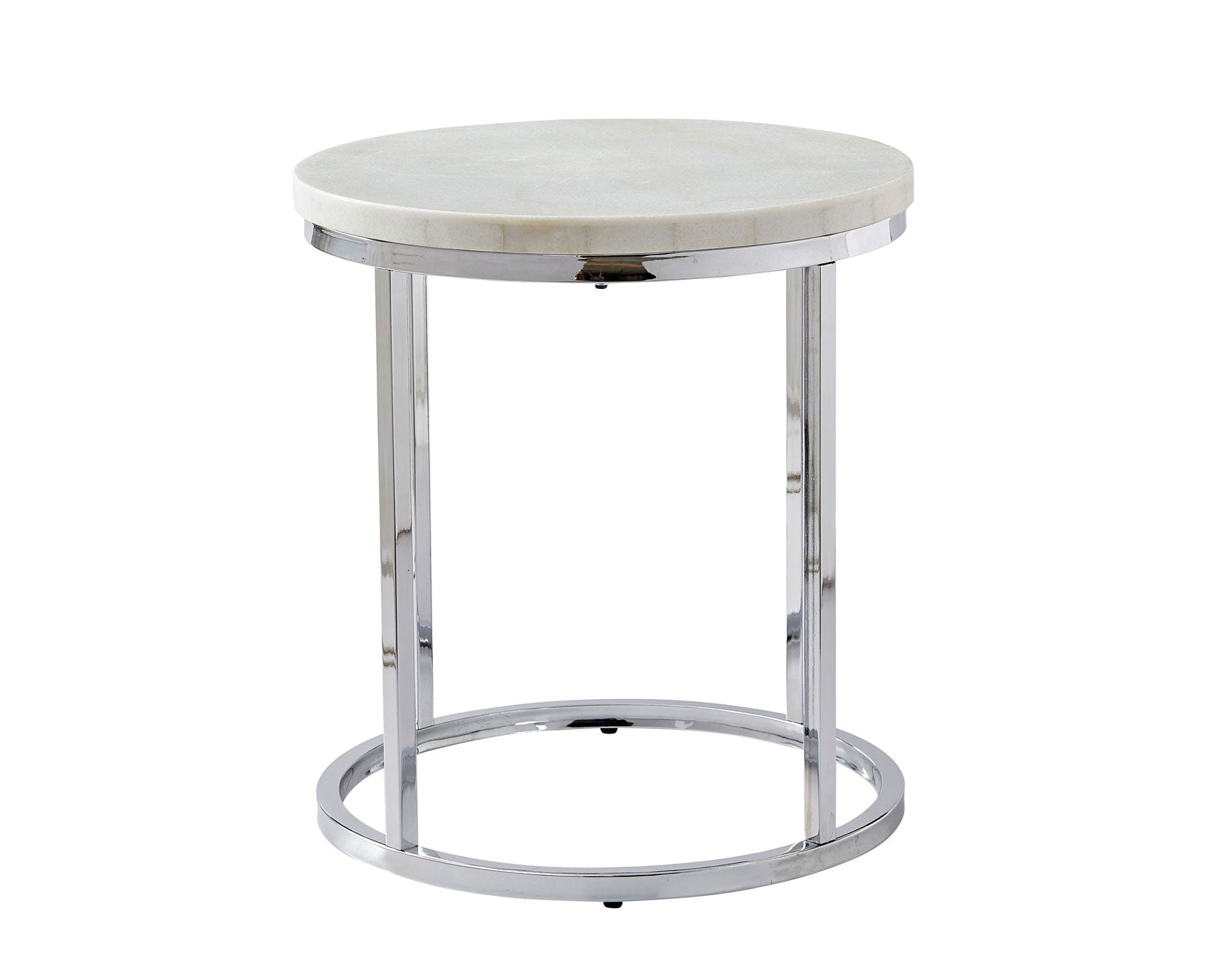 Modern and elegant, the Echo “C” Table adds surface area anywhere you need it. Great for use with a sectional or as an End Table, this table has a white marble top and a chrome-finished metal base that adds sparkle and shape to any room. Use in the middle of a large Sectional to give added work or drink surface.