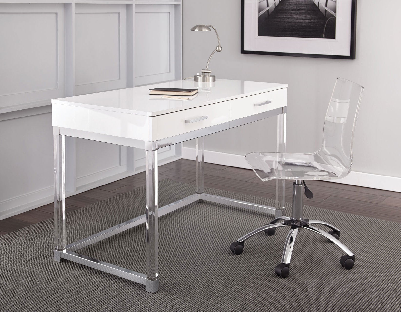 Sleek contemporary styling in a desk set that features an interesting interplay of chrome, acrylic and painted wood finishes. The compact design of the desk and chair allows it to fit in a variety of places and the mix of materials gives the desk and chair a light, airy look to complement many decors.