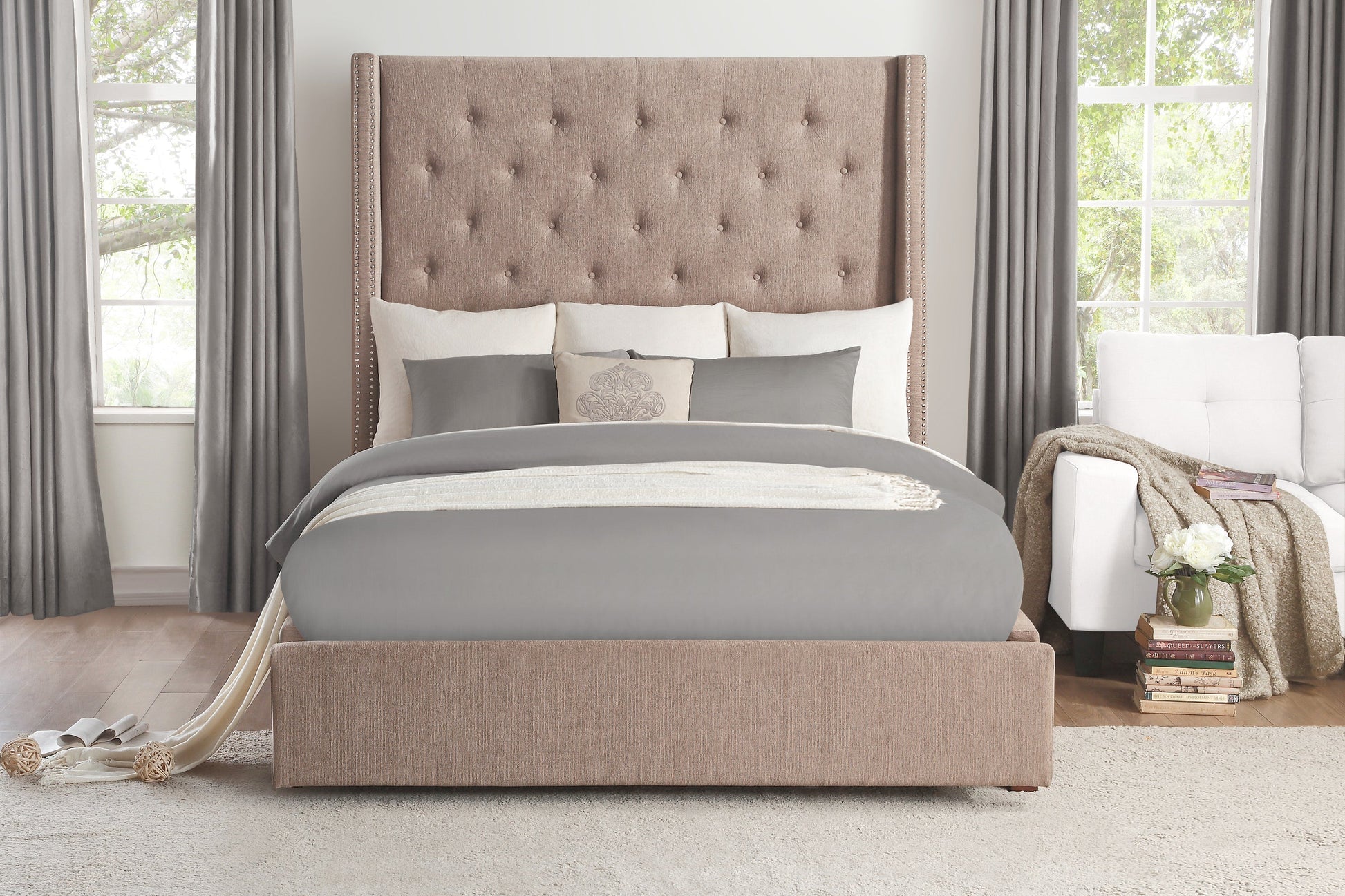 The stately profile of the Fairborn Collection will lend an air of understated elegance to your bedroom. The full mansion headboard features nailhead accent and button tufting creating a modern traditional look that defines your personal style. Brown fabric covers the bed, providing neutral complement to your decorative bedding.