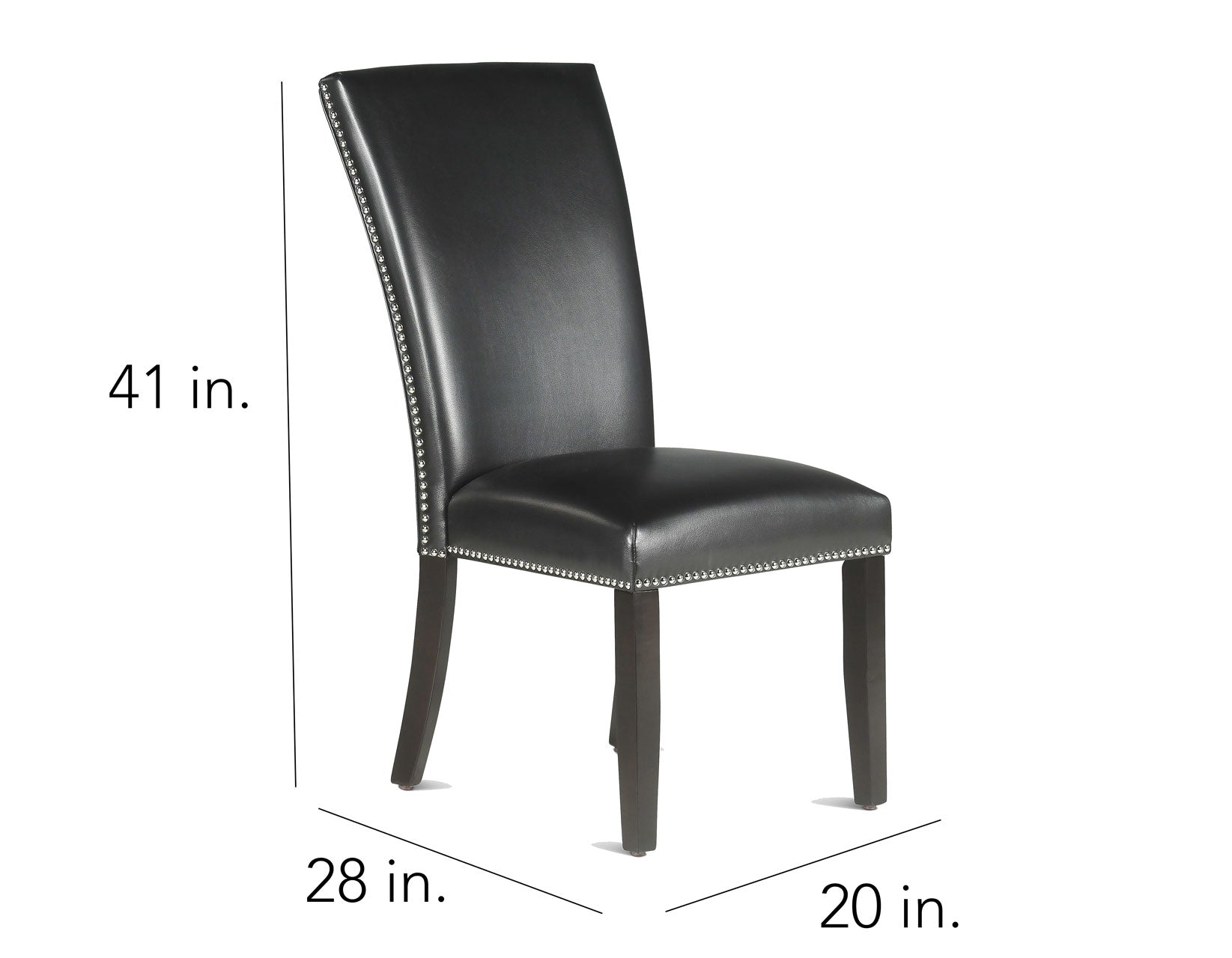 An elegant upholstered Side Chair in black leatherette, Finley sparkles with a nickel nailhead trim that is anchored with an espresso wood finish. A flared back adds sophisticated charm to the design while also ensuring a comfortable seat whether dining, at a desk or as a guest chair in the family room.