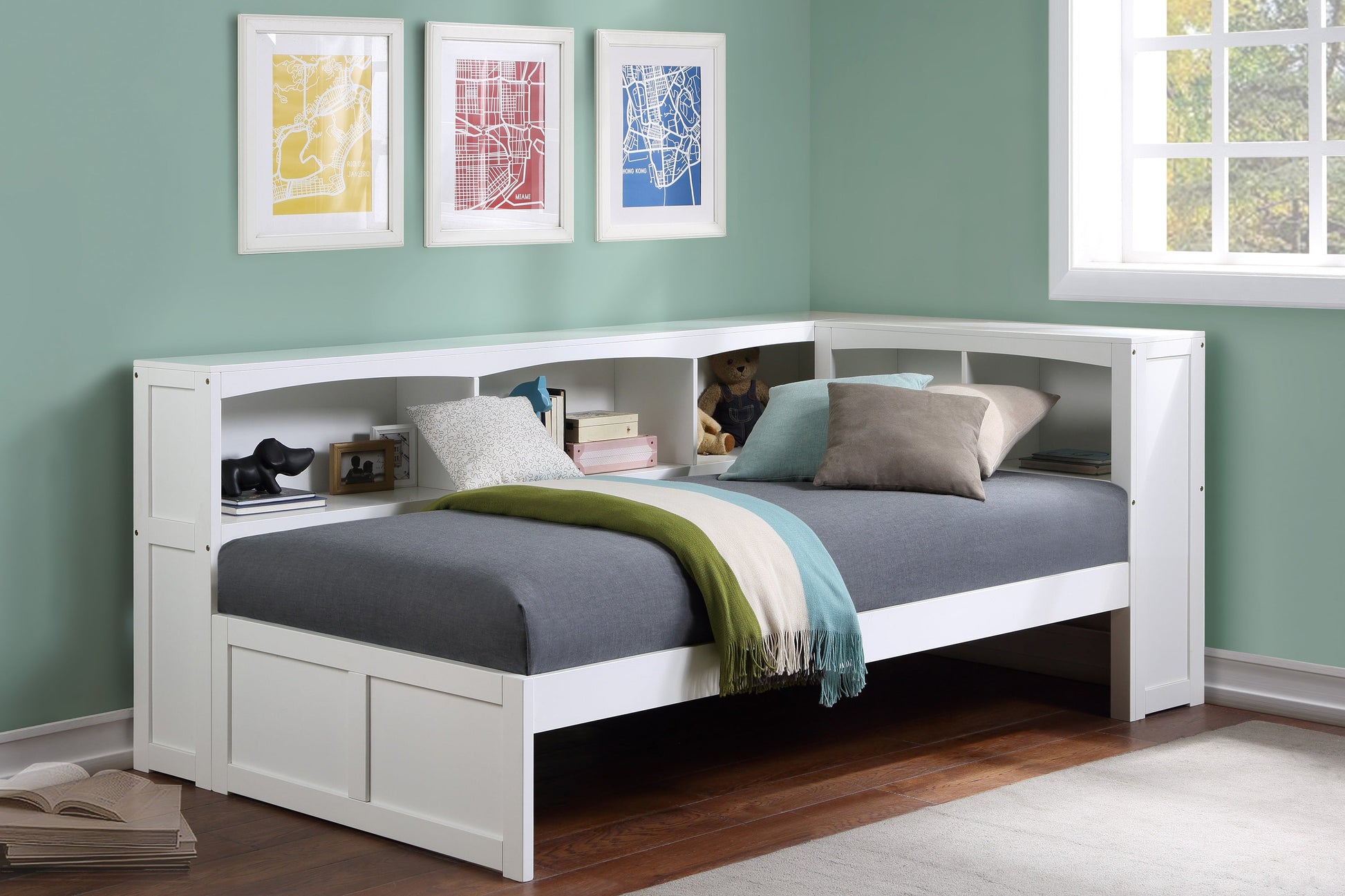 Maximizing sleep space is achieved with the stylish Galen Collection. This transitional twin corner bookcase bed is featured in a white finish making it an appropriate choice for a number of youth bedroom settings. The bookcase headboard allows for convenient storage within arm’s reach.