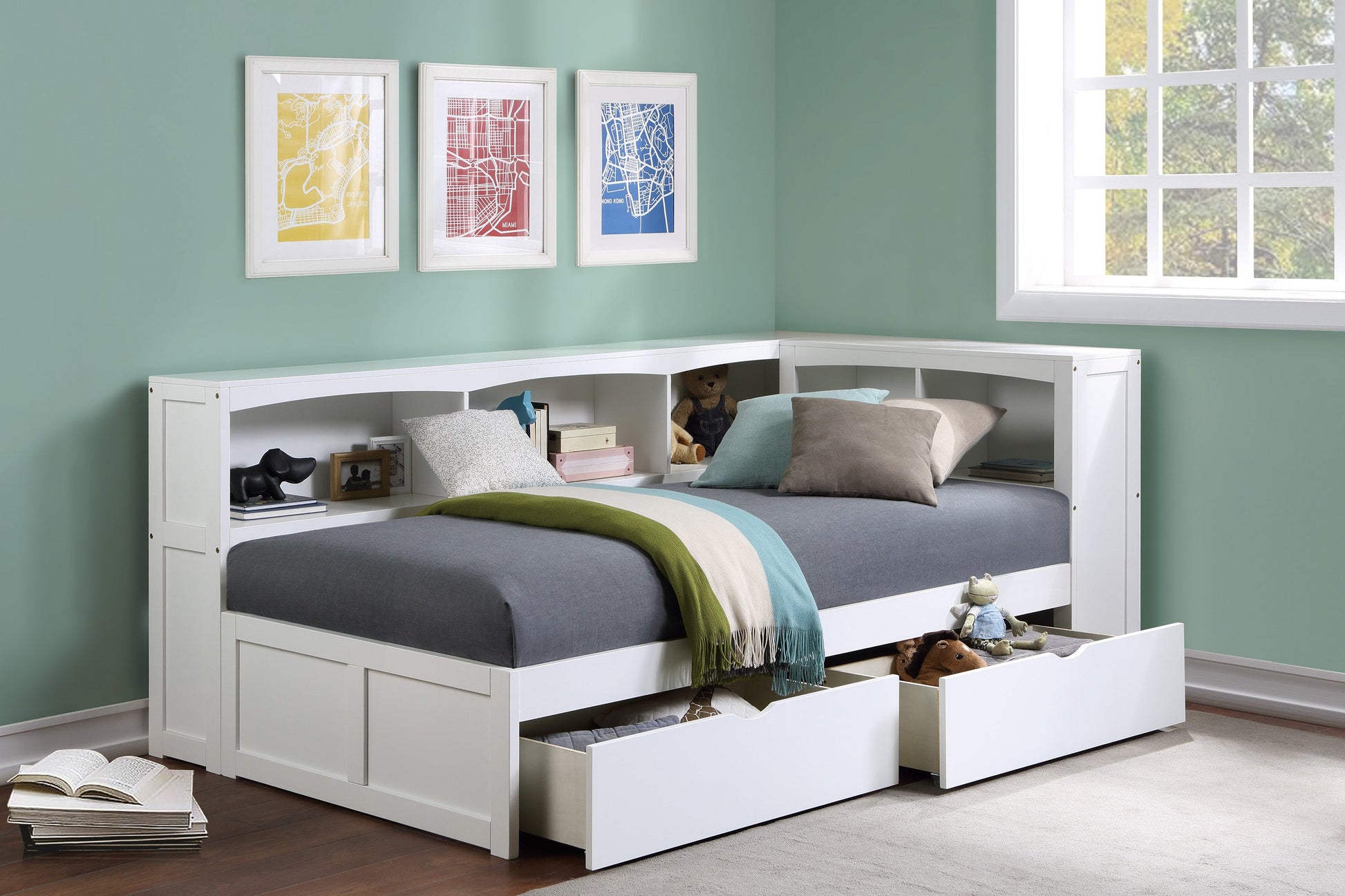 Galen White Twin Bookcase Corner Bed with Storage Boxes