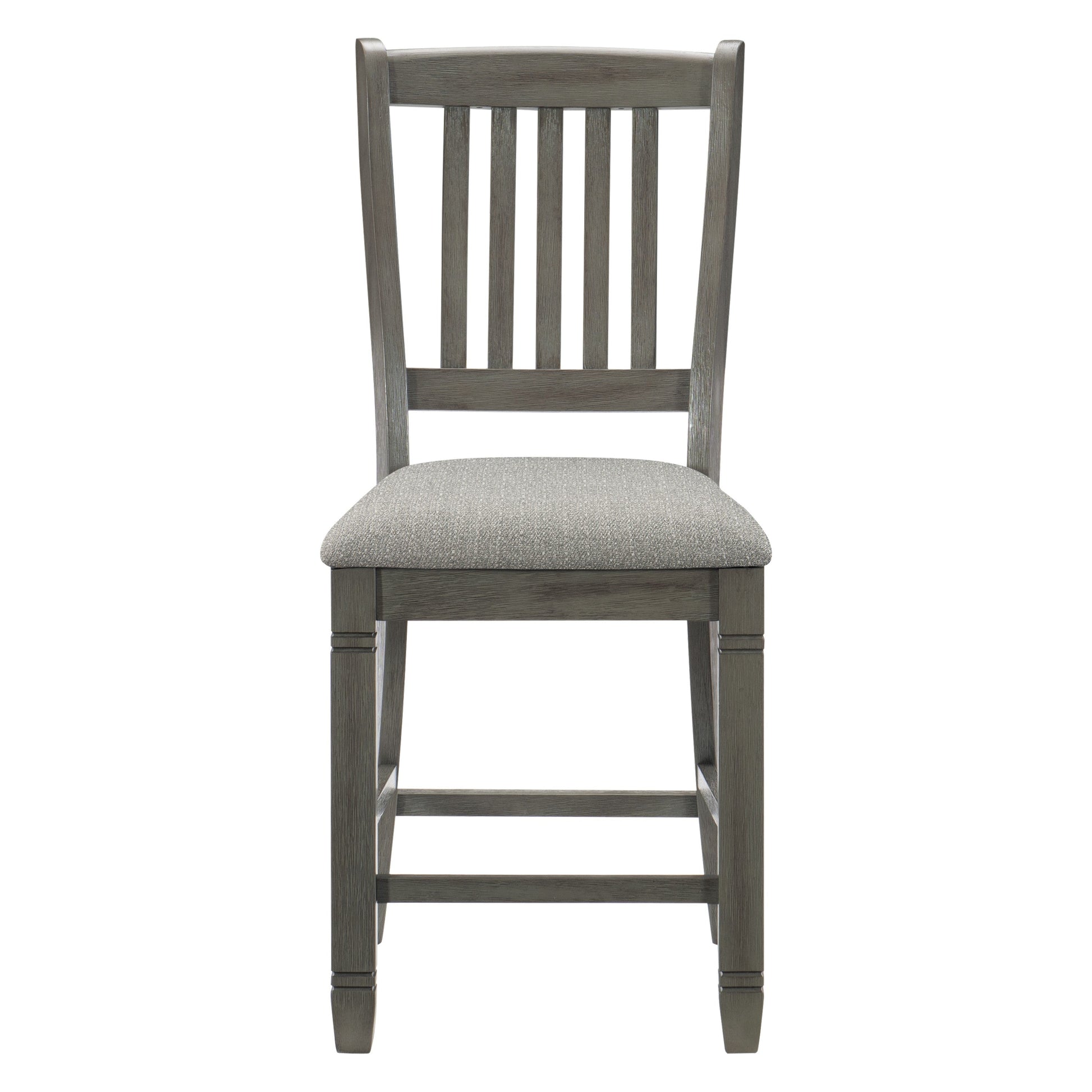 Inspired by the aesthetic of a casual country kitchen, the Granby Collection is an inviting gathering spot for mealtime with family and friends. The wood frame of the counter-height side chair is finished in antique gray and features a neutral tone gray fabric seat.