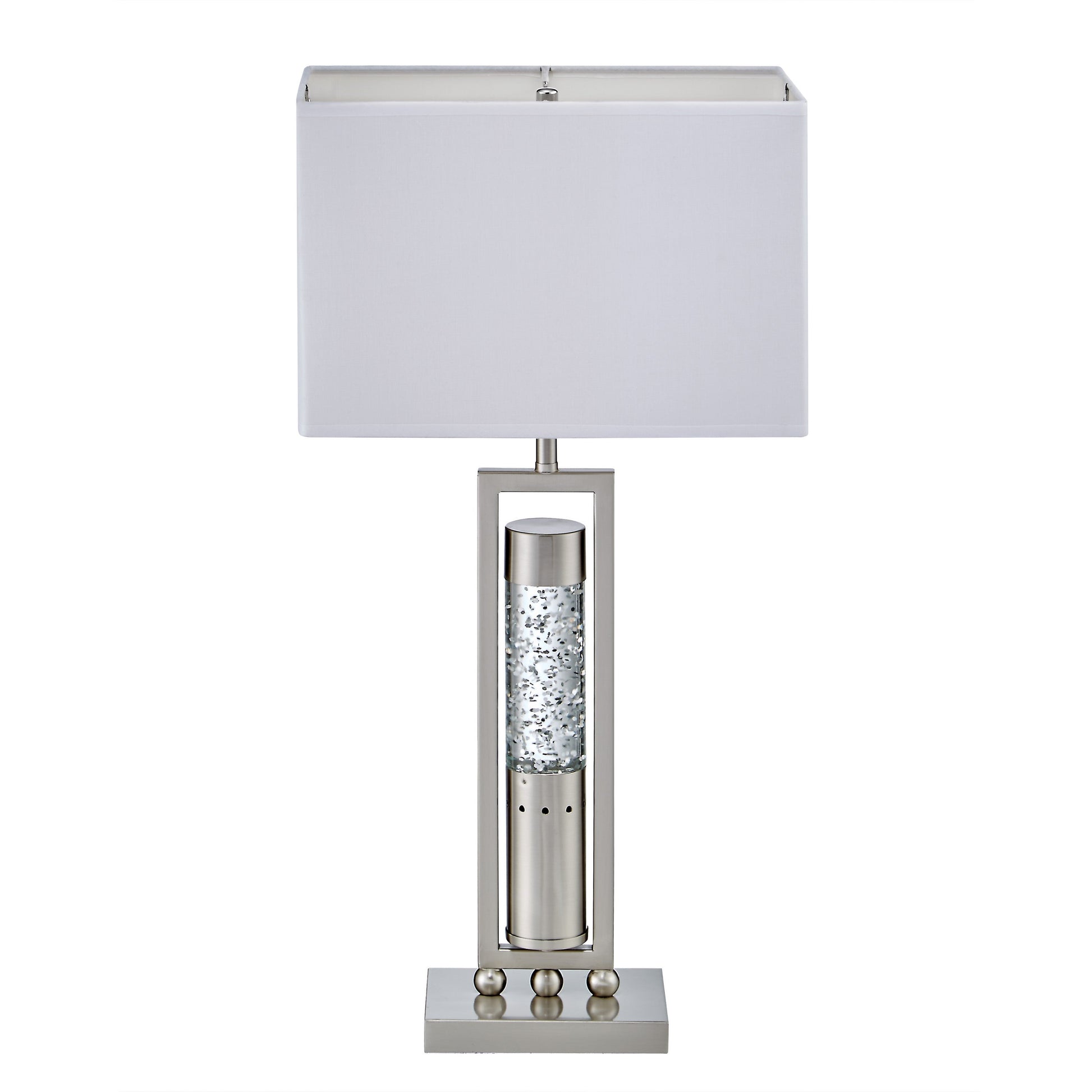 This accent lighting can change the ambiance of any room. Its ultra modern design showcases sparkling decorative mood light, with tiny rippling water-droplets to simulate the soothing dancing water motion. Beautifully crafted stand features high quality satin nickel finish metal and glass, and an elegant rectangular lamp shade. Great addition piece on your night stand, end table, or sofa table. It offers flexible lighting solution: a table lamp with a main light that is suitable for reading, perfect for a night light, and to create the mood in any room.