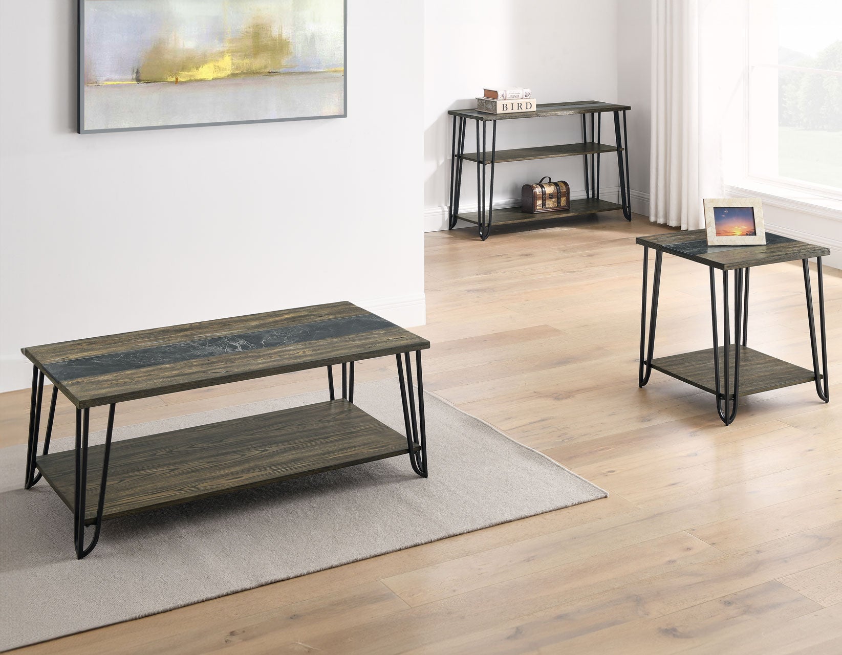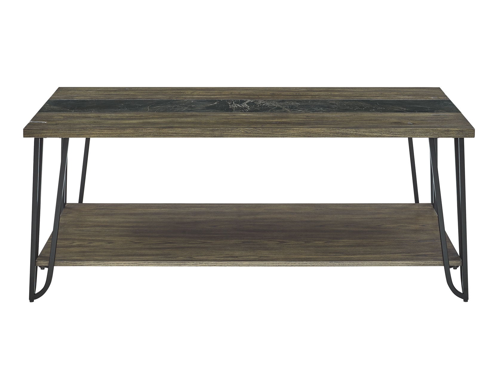 The Harper Cocktail Table, measuring 45 inches in length, is a masterful blend of casual rustic charm and mid-century modern elegance. Crafted with a distressed dark driftwood finish and a striking slate inlay, it’s a mixed-media gem that anchors any living space. Its canted loop iron legs add a touch of retro flair, while the bottom shelf offers ample space for display or storage. This table is an ideal centerpiece for a casual yet modern living room, offering both style and functionality.