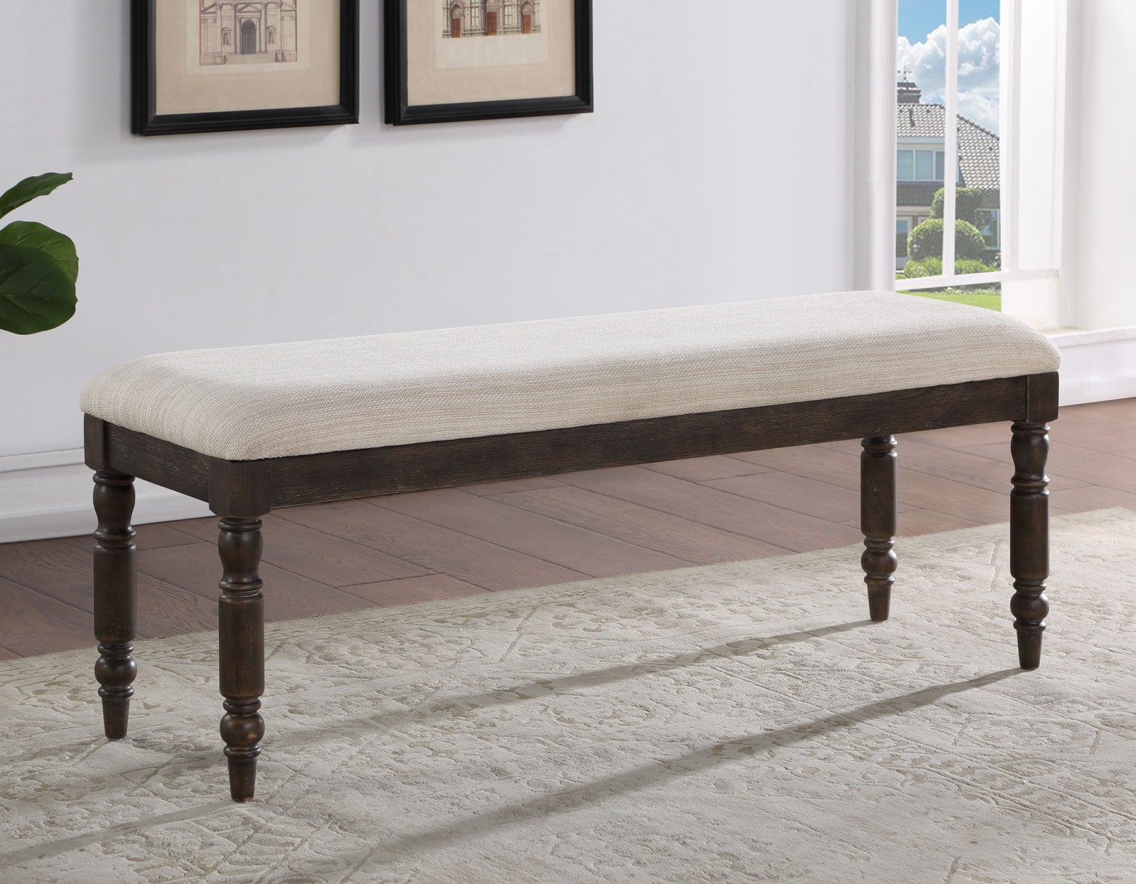 Classic design in a bench for dining or hallway areas. Part of the Hutchins dining collection, this bench features a comfortable upholstered seat and is ideal for seating multiple people for dining in a mudroom or a hallway.