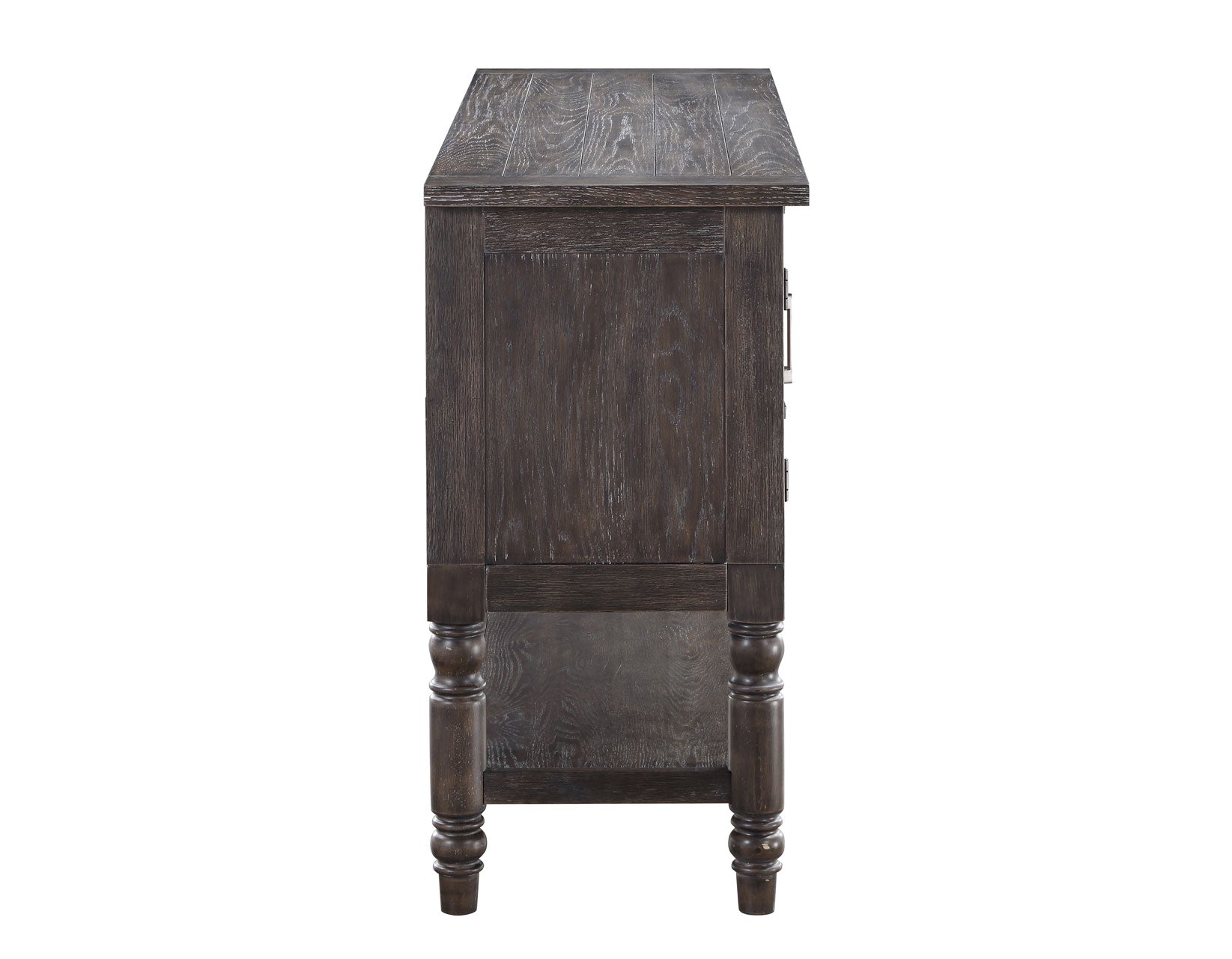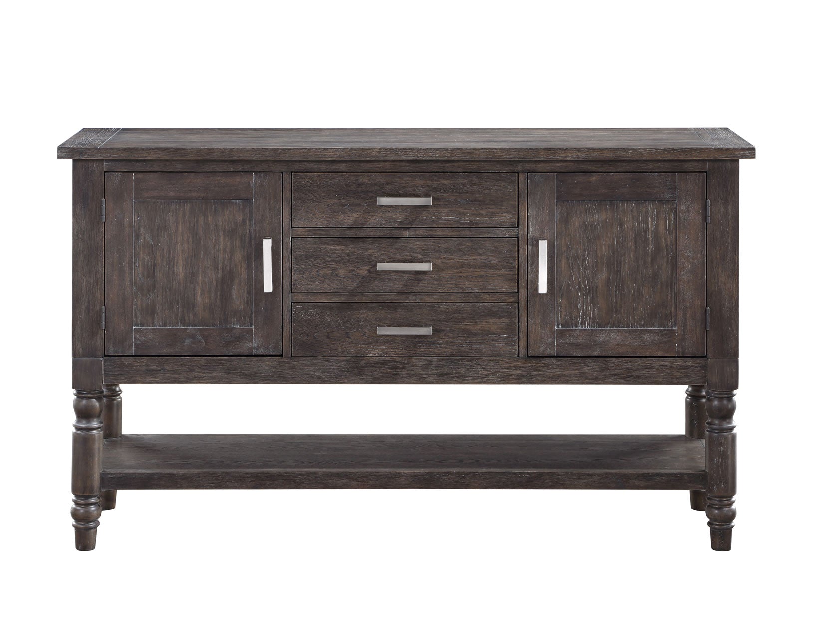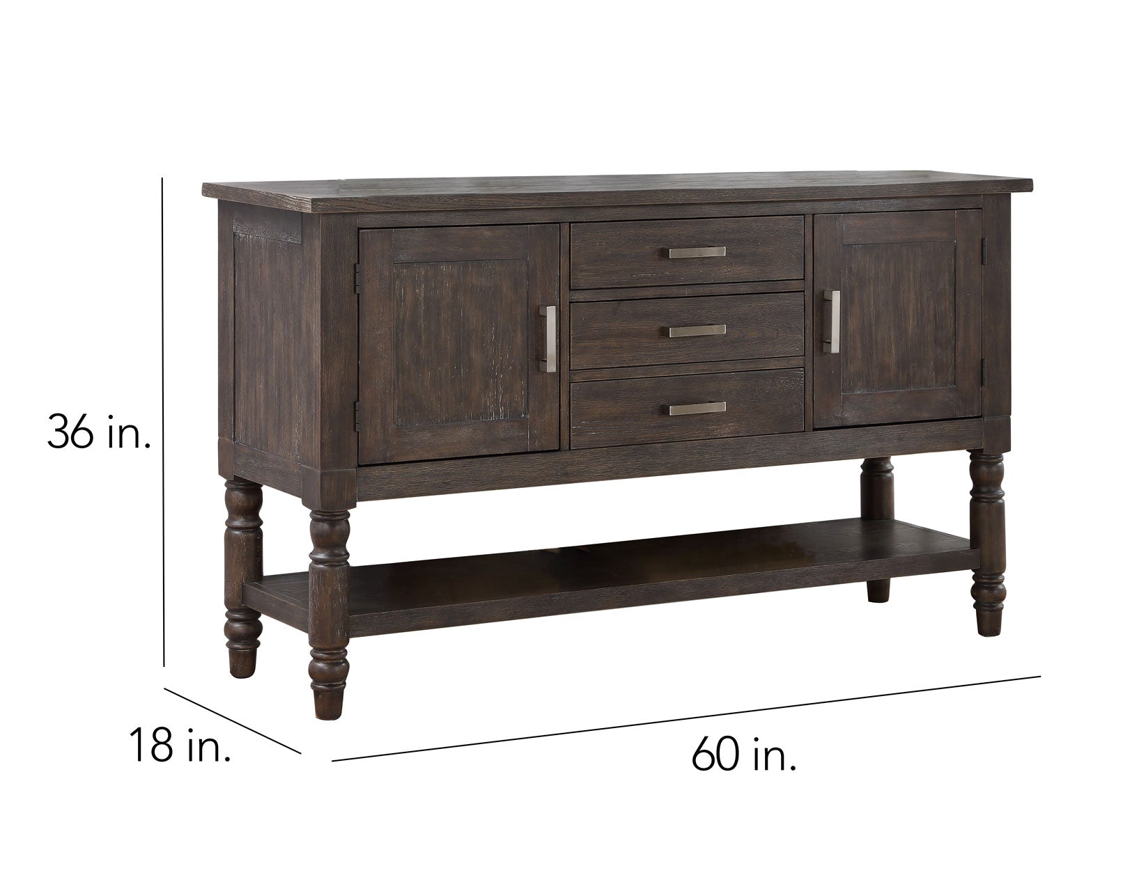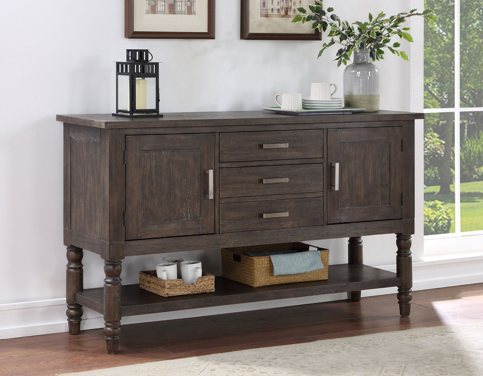 This Server from the Hutchins dining collection adds generous storage and serving area to any dining area. A combination of modern and traditional styling, this piece mixes turned legs with clean lines in an instant classic. Three drawers and two doors add valuable hidden storage and a bottom shelf adds an area for storage or display. This Server, with its dusty espresso finish and full 60-inch length, will anchor any dining area with elegance and style.