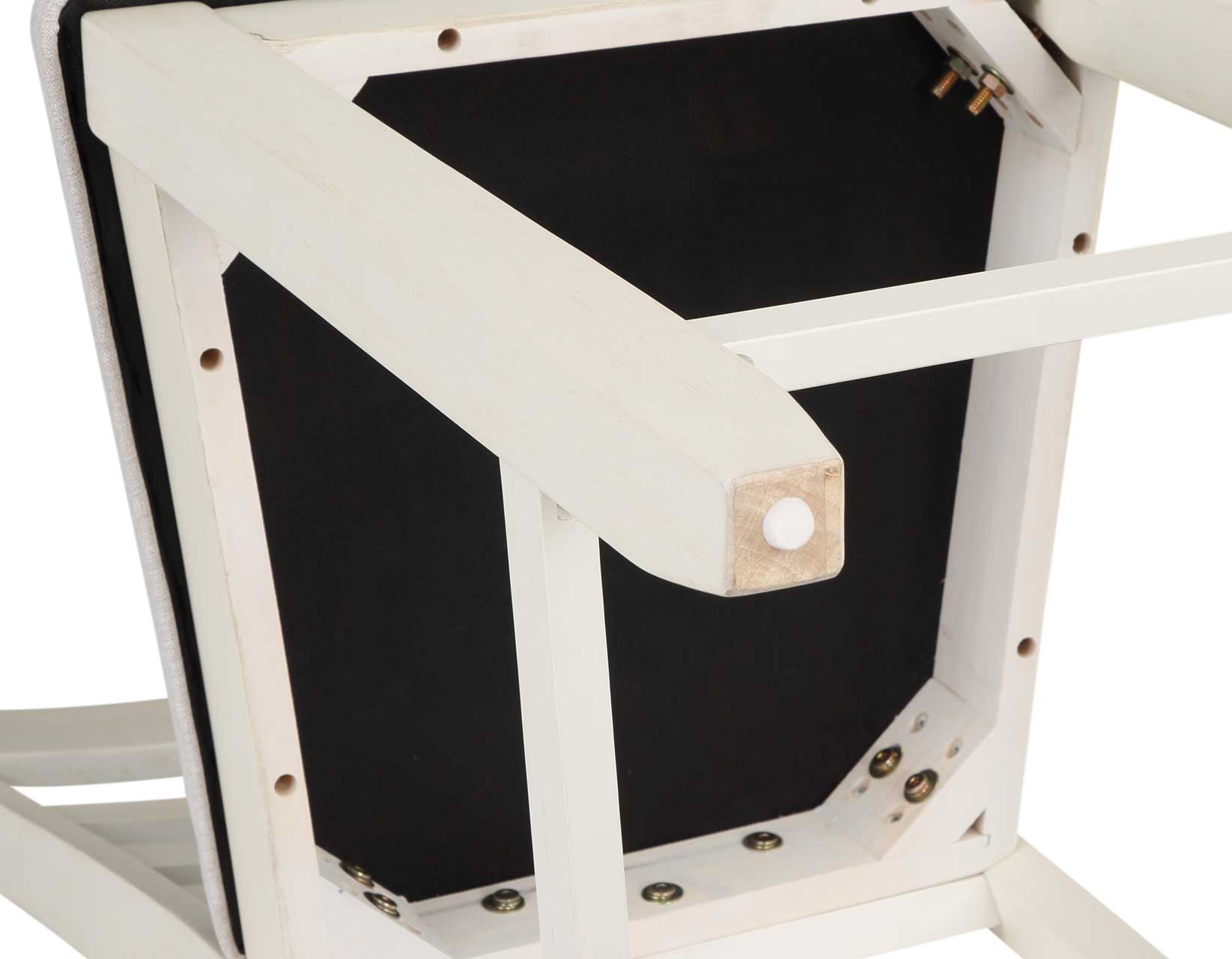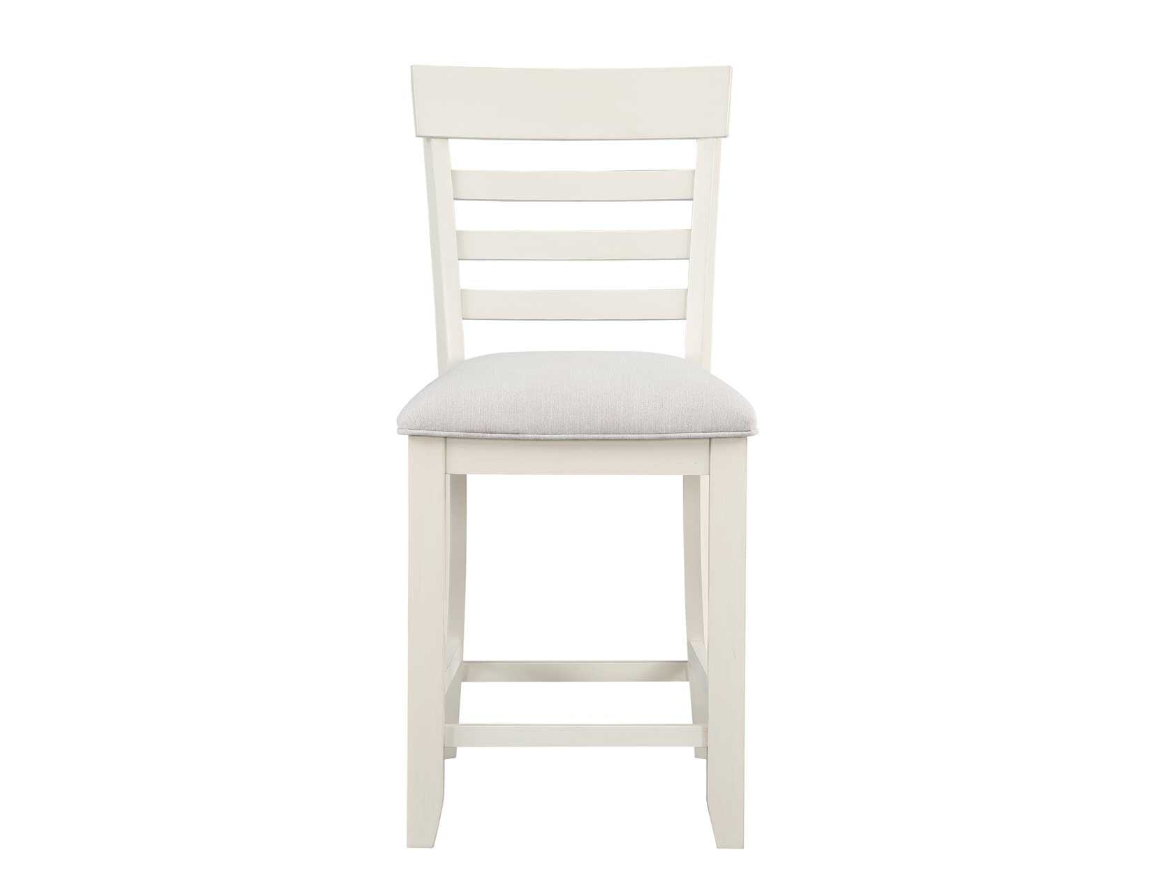An upholstered Counter Chair that sports a crisp white finish and cream-colored fabric seat for a fresh, comfortable addition to any kitchen or dining area. The horizontal slatback design features a shaped top rail for a relaxed transitional appeal for modern, farmhouse or coastal environments. Stretchers add structural support and a place to rest your feet when seated at the Hyland Counter Table or a Counter Bar.