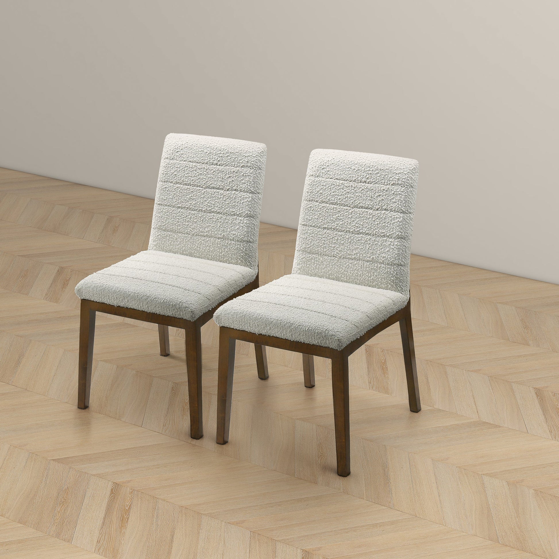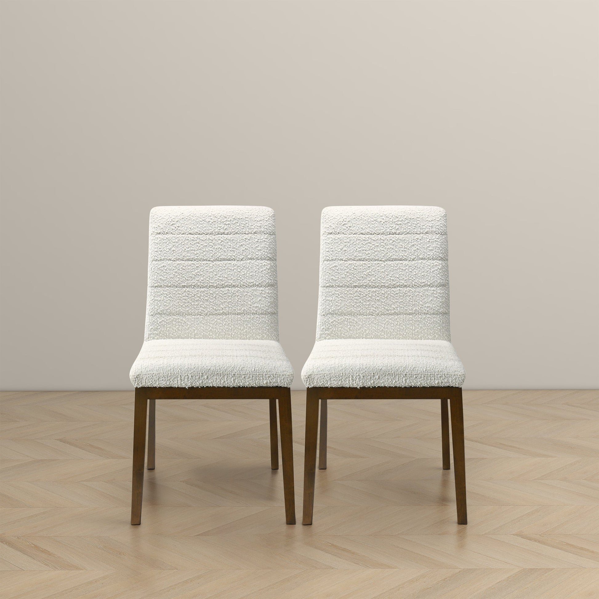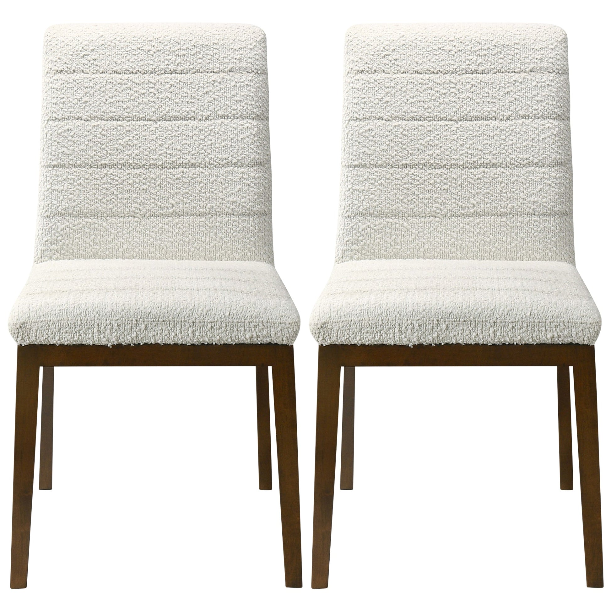 Introducing our Modern Dining Chairs – a seamless fusion of comfort, style, and practicality for your living spaces. Crafted with a solid wood walnut-colored base, these dining chairs effortlessly infuse a hint of mid-century modern charm into your home. The set of 2 white fabric boucle upholstered chairs not only radiate sophistication but also guarantee a snug and enjoyable dining experience.