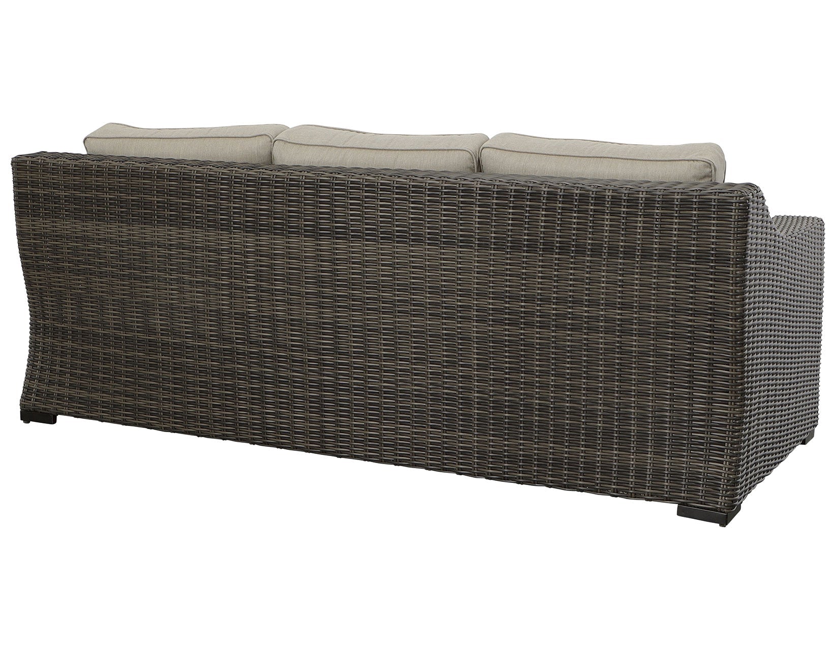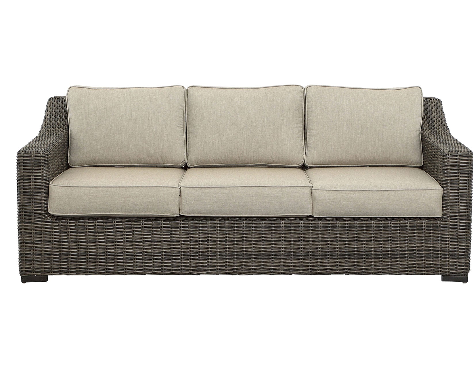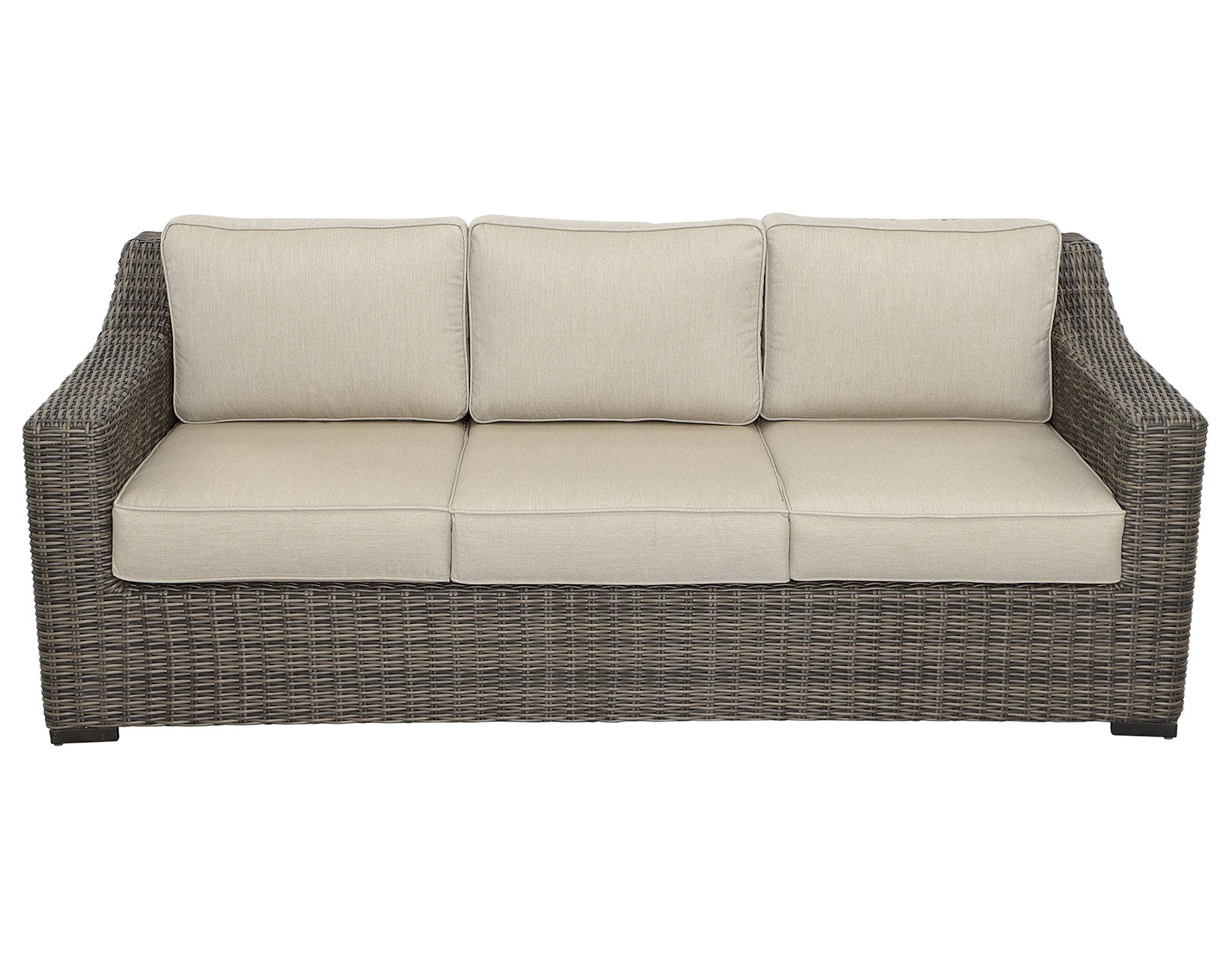 The Jones seating group offers a classic Sofa and Chair combination in a full-round resin wicker package. The matching chair is available in stationary or full-swivel models. The dark gray aluminum Coffee Table proves a suitable companion to the seating with its mission influences and bottom shelf.