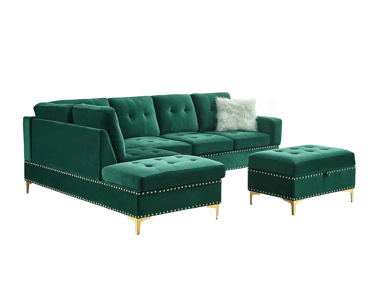 S123 Joy Green Velvet Reversible Sectional with Ottoman