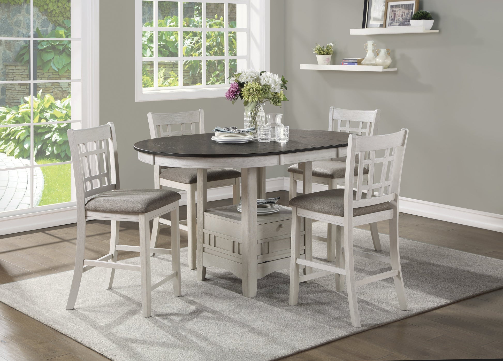 Utilizing the traditional elements of mission styling, the Junipero Collection adds the feel of the Arts and Crafts design movement to your casual dining room. Framing, unique to the classic style, comprises the profile of the wood-framed counter height chair back. The white finish over oak veneer serves to highlight the wood’s grain.