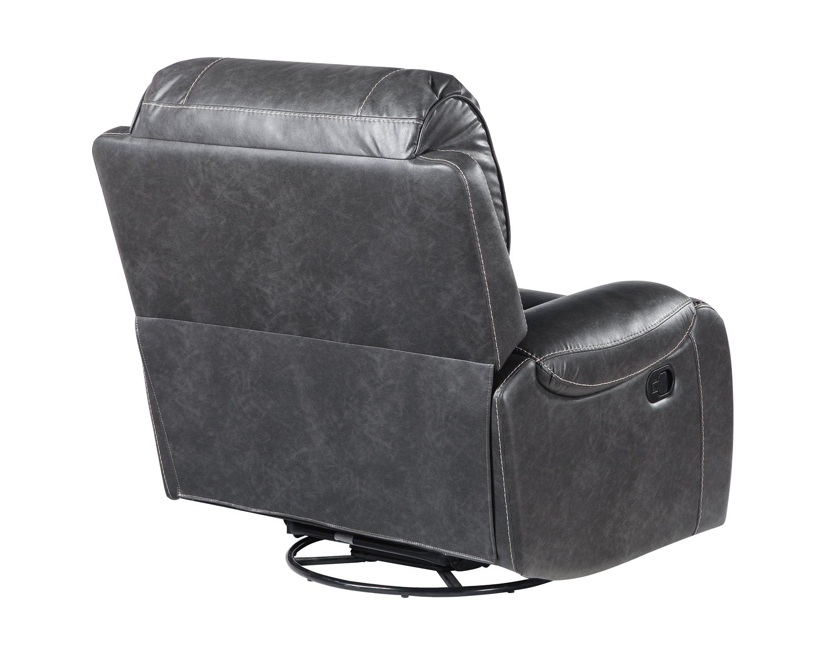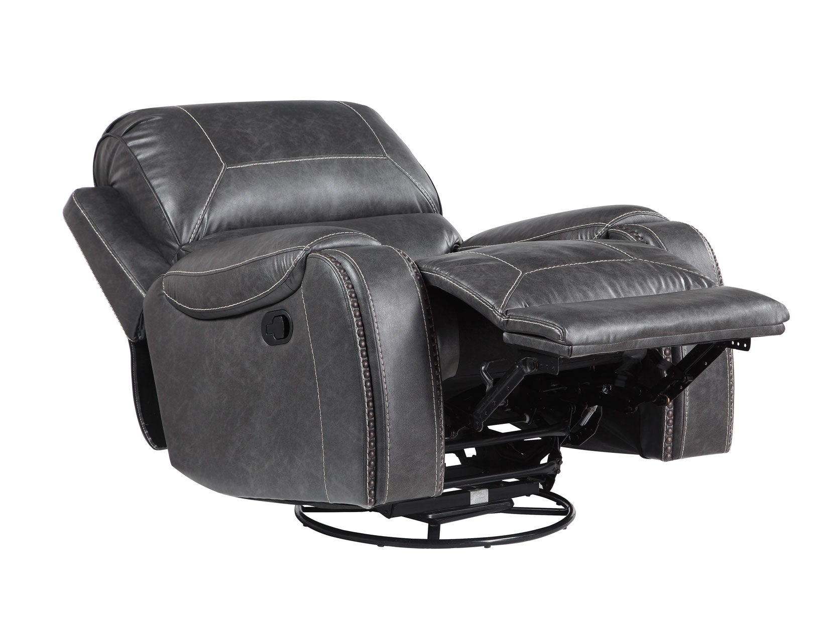 Superior comfort and style are the hallmarks of this motion set. Featuring a leather-like cover with baseball stitching, this ensemble comes with a Sofa with a drop-down console & USB charging station; a Loveseat with dual rocker/recliner ends; and a rocker/recliner Chair with 360-degree swivel. Antiqued brass nailhead trim and padded arms complete this ultimate motion package.