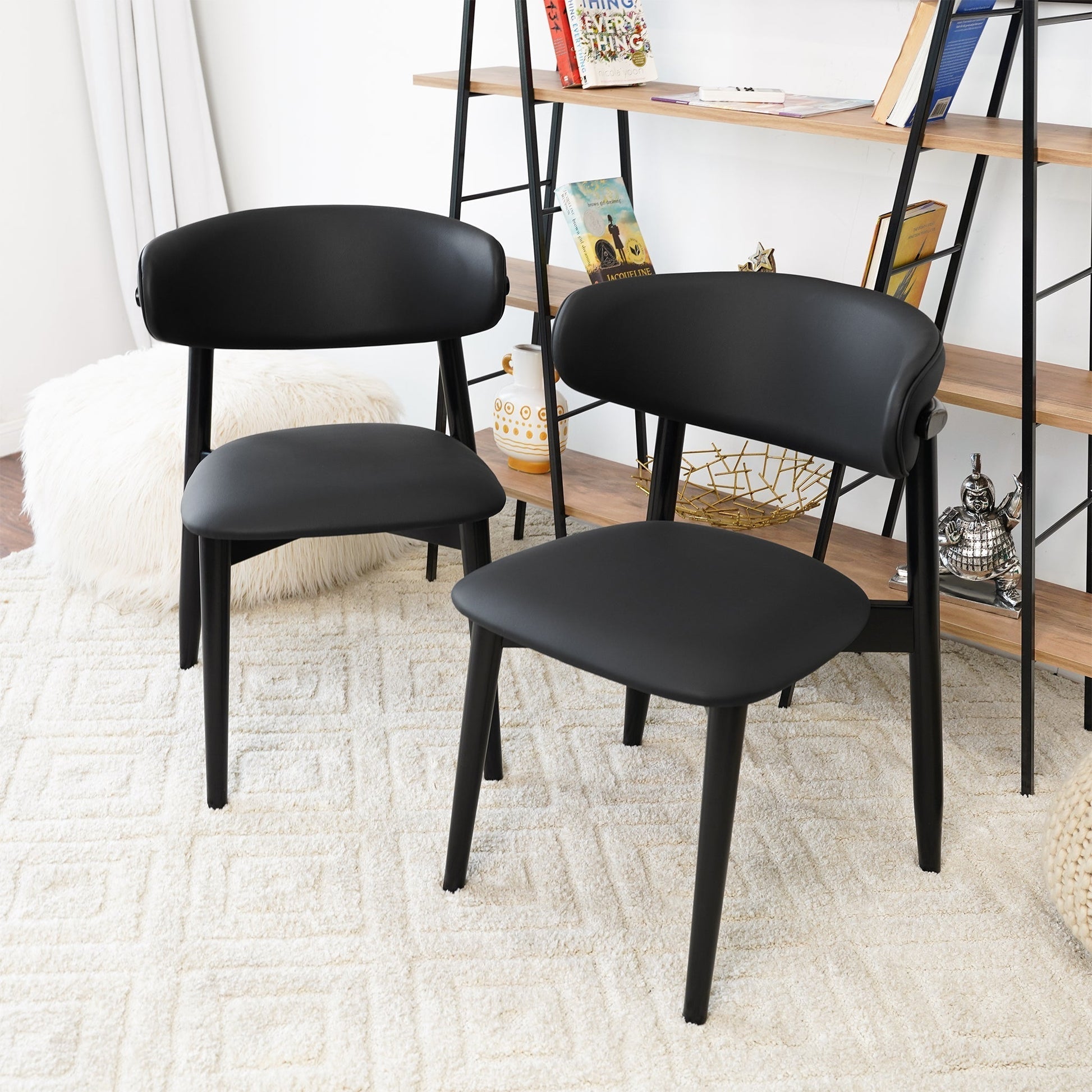 Give your dining room or kitchen a touch of elegance with the Korbin Mid-Century Modern Black Vegan Leather Dining Chairs. This two dining chair set is made of a durable Solid Wood frame and featuring a high-density foam cushion, the dining chairs present a lovely structure for an additional high level of comfort and back support. Can be cleaned with a non-abrasive cleaning solution followed by a quick microfiber cloth. With little assembly needed, you can quickly start entertaining with no hassle! Available in various timeless colors, you're sure to find something that matches your decor.
