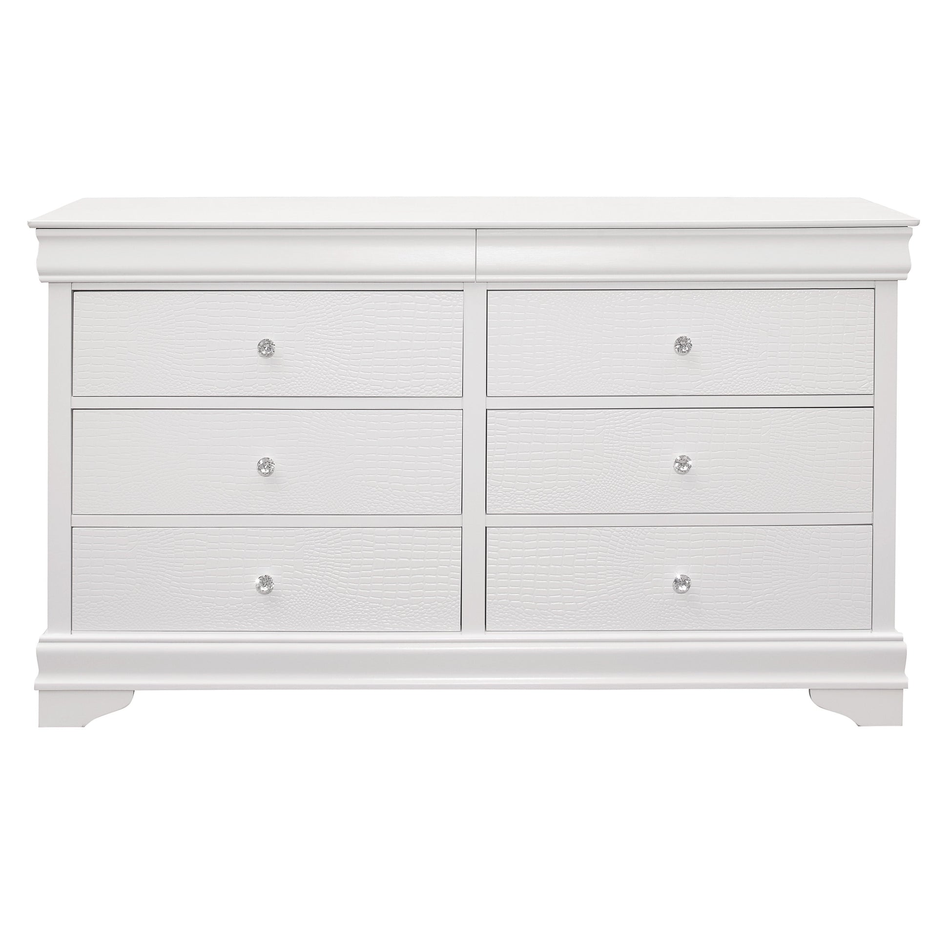 The unexpected intersection of traditional design and glamorous styling creates the dynamic look of the Lana Collection. A white finish is utilized to enhance the faux alligator embossed drawer fronts of the dresser with crystal faceted knob hardware lending an additional fabulous touch. The dresser features hidden storage allowing for the discrete placement of your personal affects.