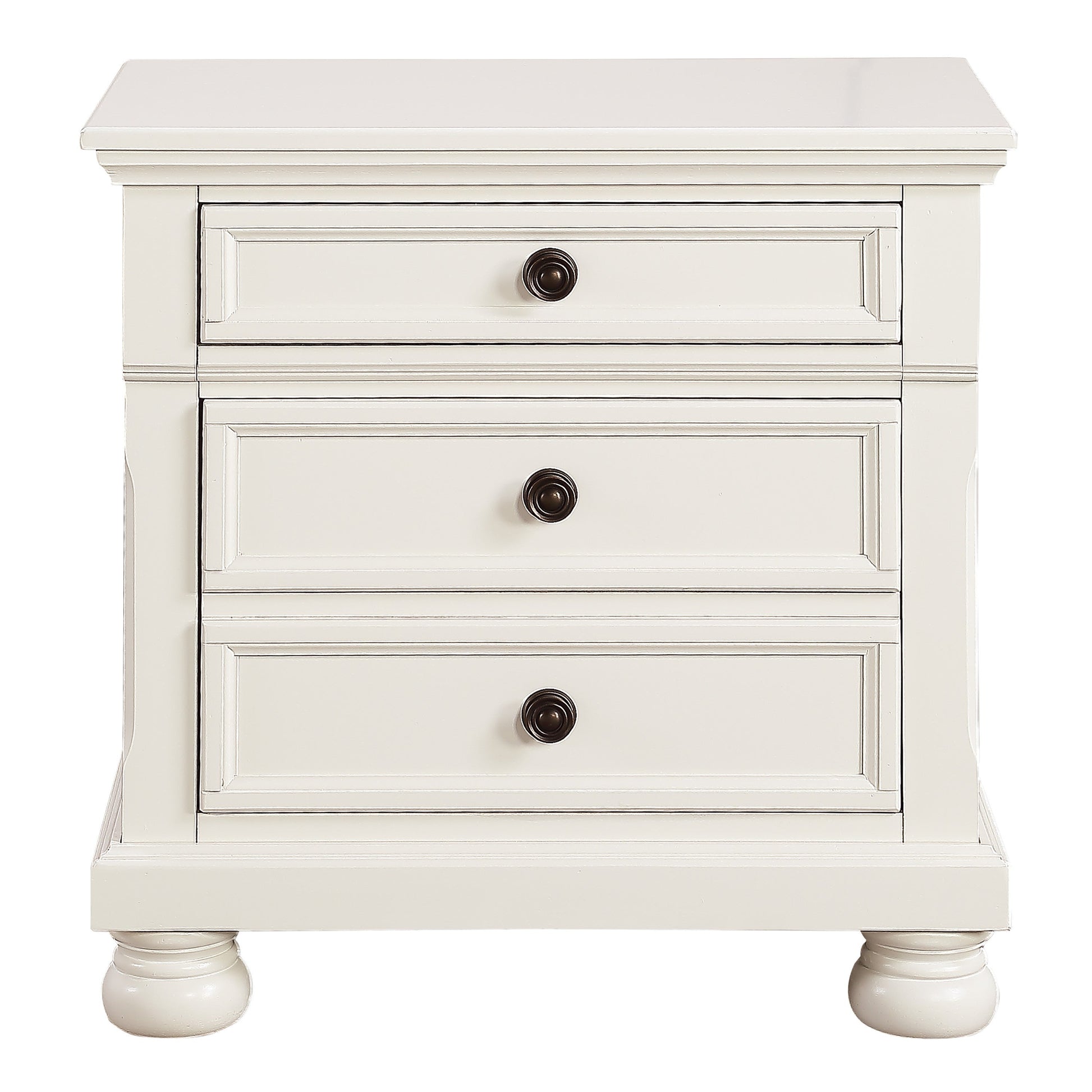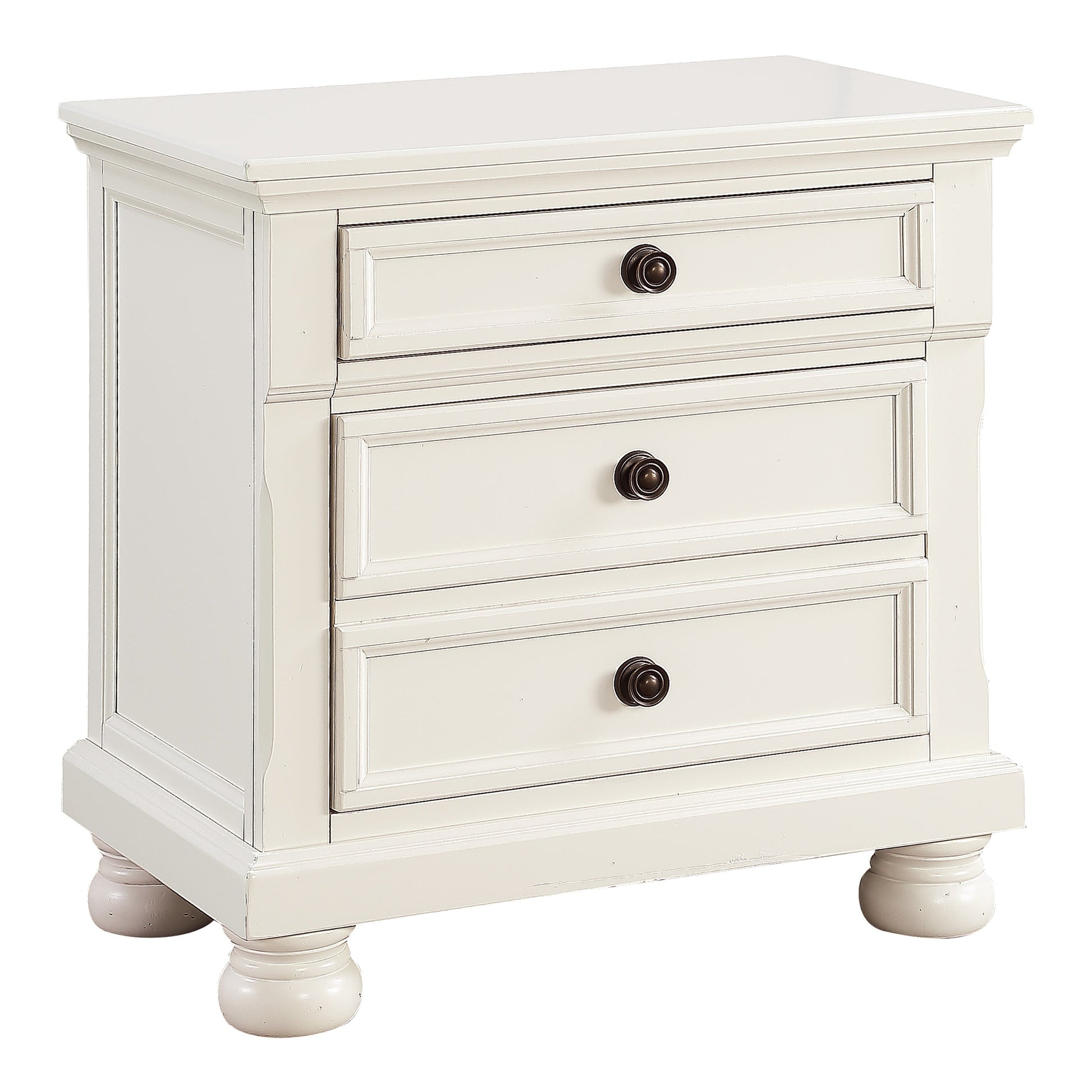 Casual transitional styling lends versatility to the placement of the Laurelin Collection in a number of bedroom settings. The nightstand's white finish can transition from traditional to country casual, with antiqued bronze knob hardware punctuating the look of each framed drawer front and bun feet providing support. The hidden drawer of the nightstand provides discrete storage space for your valuables.