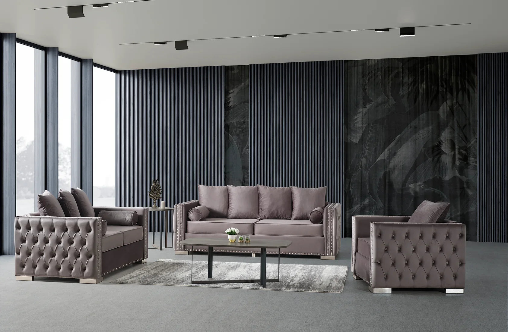 The Lotus Grey Living Room Set features a sleek and modern design with clean lines and a neutral color palette that easily complements any decor style. The plush cushions are upholstered in a soft, grey fabric that feels luxurious to the touch and is easy to clean.