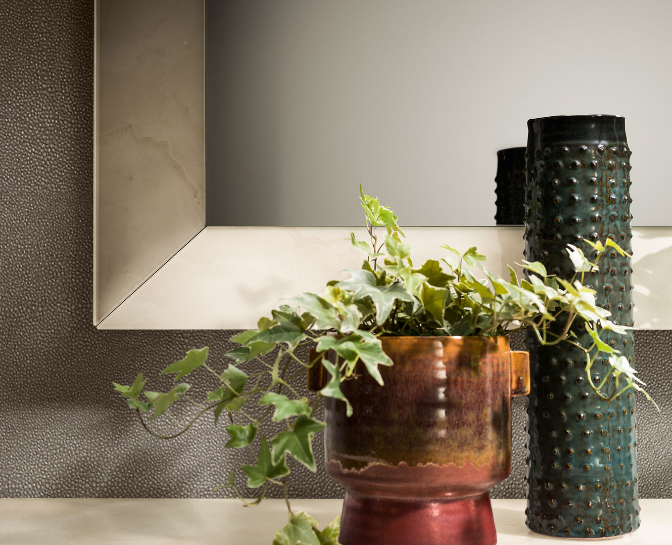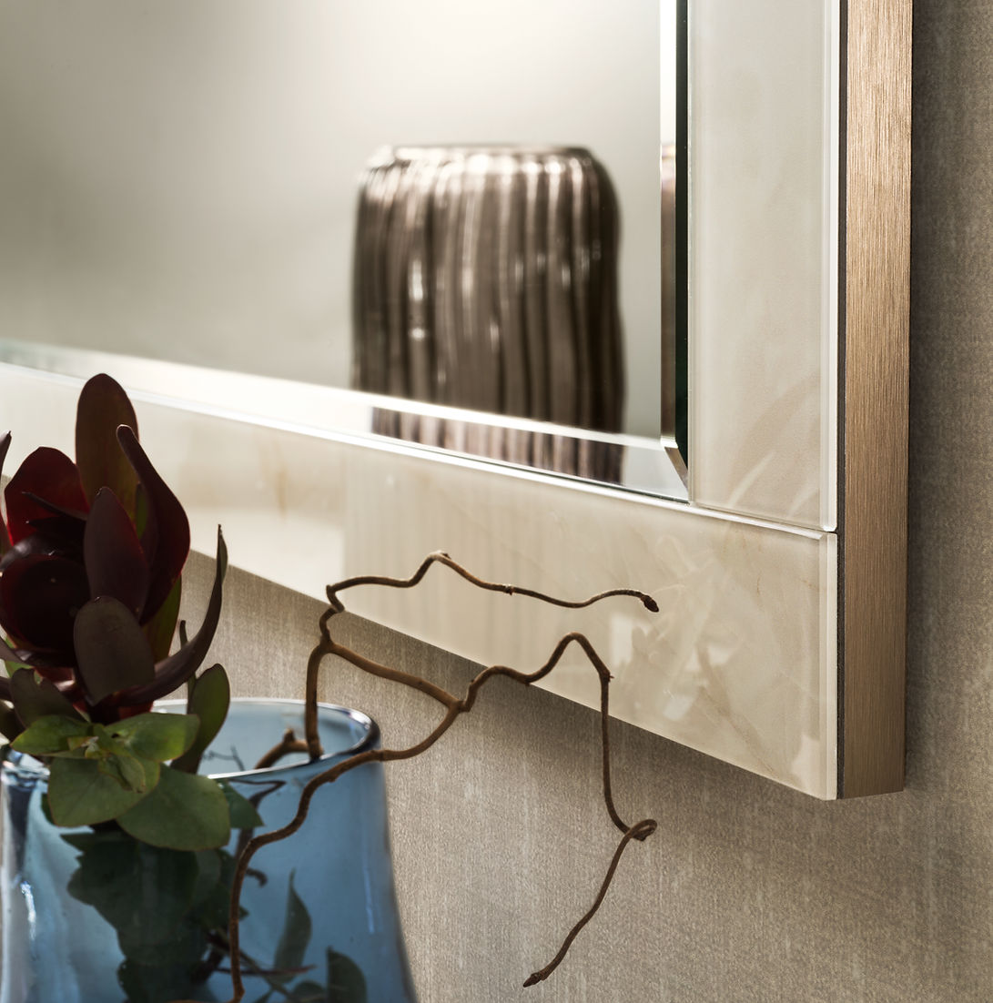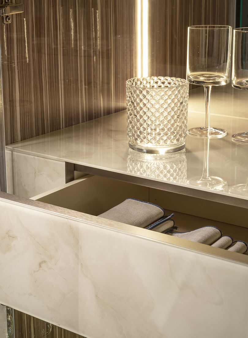 Made in Italy design and contemporary mood for Adora’s Luce Light collection, designed to furnish the living room, dining room, and sleeping area with style and elegance. A sober and minimalist collection that emphasizes asymmetries with contrasting materials and shapes. The leitmotiv of the collection, besides the light element that gives it its name, is the search for a balance between density and transparency, references and variations. The asymmetry is fuelled by the alternation of open compartments and closed volumes and also by the coexistence of the Light Onyx effect(cold and shiny) on the tops and sides, and the Zebrano wood effect finish (warm and neutral)of the doors. Champagne-colored satin-finished metal feet and handles are deliberately minimalist, to leave the starring role to furniture and display cabinet design. Both the mirrors and the lights inside the furniture elements give the collection an overflow of brightness, perspective, and contemporary appeal. The furnishing concept rewards dynamism and sartorial design typical of contemporary style, without losing sight of fine materials, sophisticated design, and luxurious details.