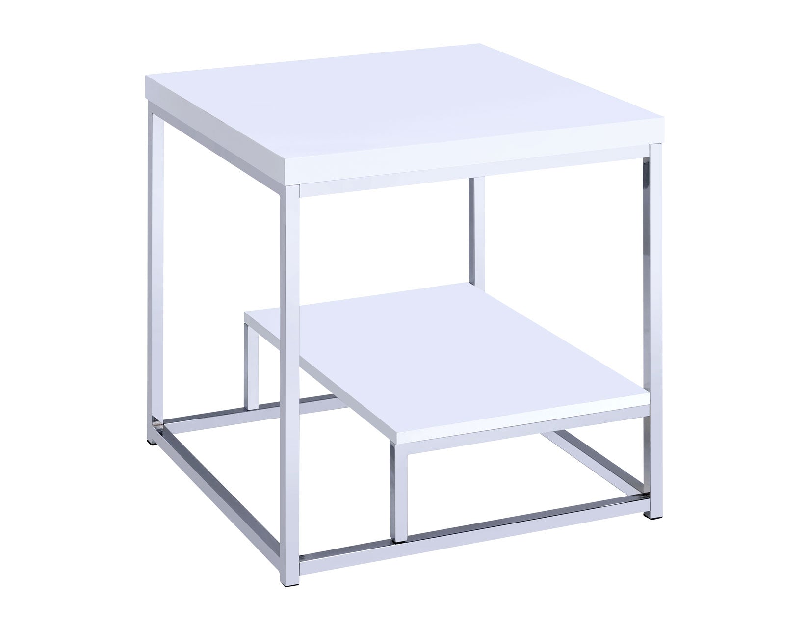 A contemporary collection of tables featuring chrome bases and white tops. An asymmetrical bottom shelf adds function as well as style to the collection and the Silvershield® top adds beauty and texture to the cocktail and end table.