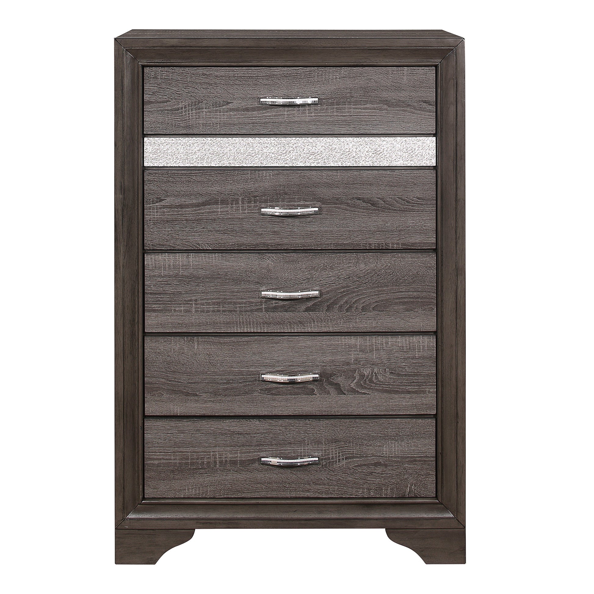 The unique styling of the Luster Collection presents a glamorous option for your bedroom. The chest’s embossed faux-wood veneer features a gray finish that allows for the acrylic silver glitter front of the hidden jewelry drawer to shine. The jewelry drawer features felt lining to protect your hidden items from wear and tear. Polished chrome bar drawer pulls front the drawers providing complementing contrast to the collection’s finish.