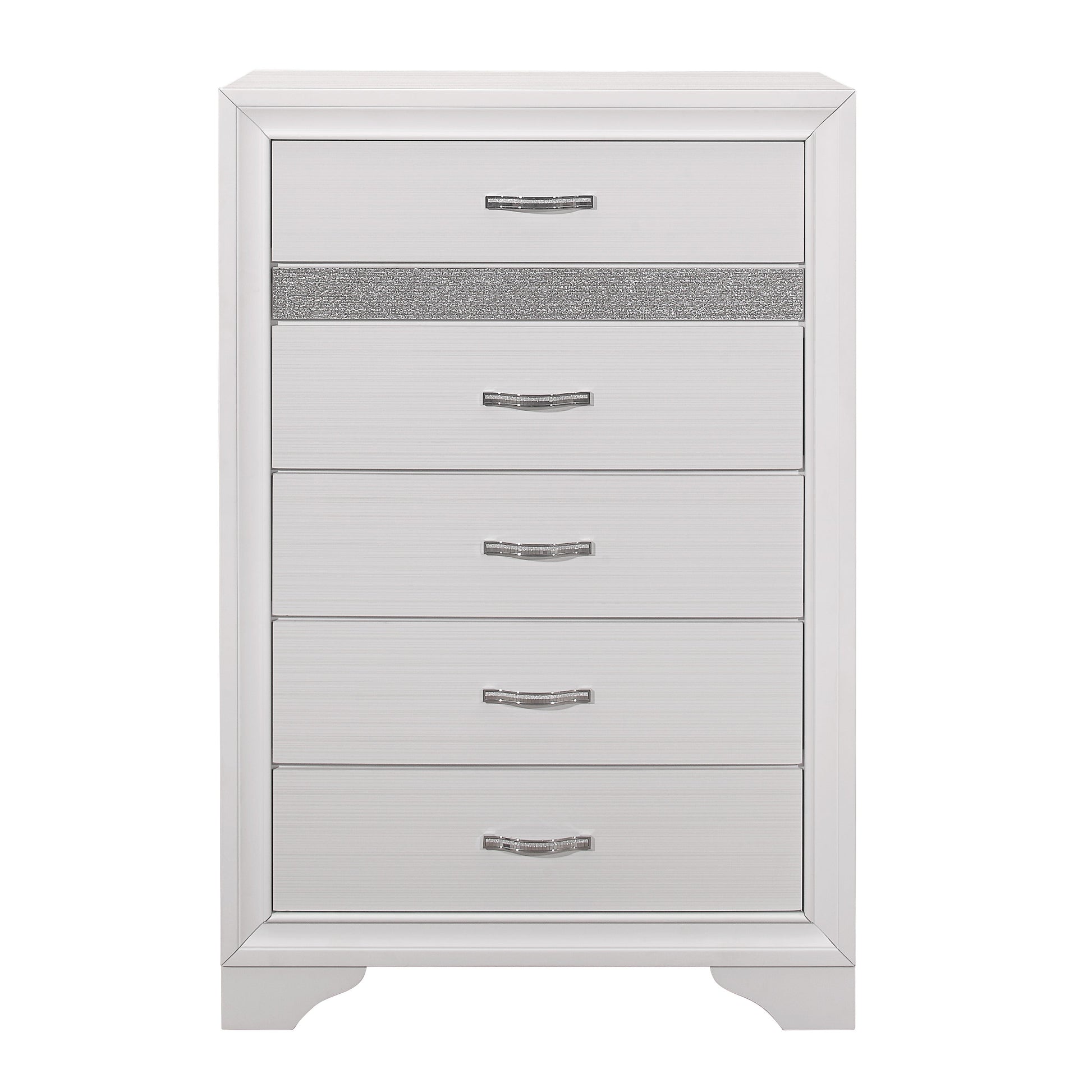 The unique styling of the Luster Collection presents a glamorous option for your bedroom. The chest’s embossed faux-wood veneer features a white finish that allows for the acrylic silver glitter front of the hidden jewelry drawer to shine. The jewelry drawer features felt lining to protect your hidden items from wear and tear. Polished chrome bar drawer pulls front the drawers providing complementing contrast to the collection’s finish.