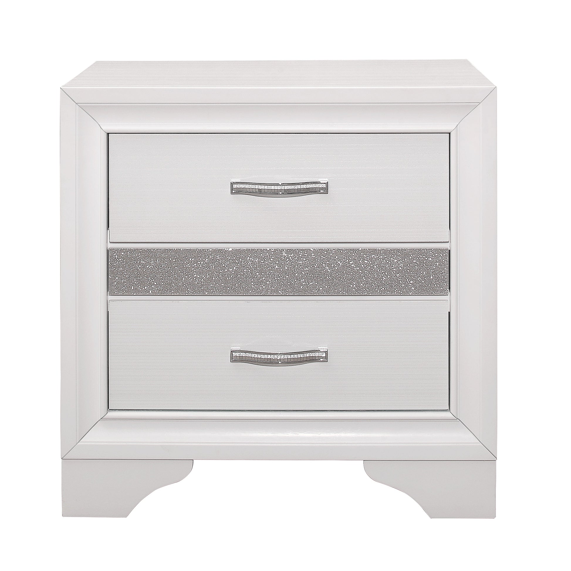 The unique styling of the Luster Collection presents a glamorous option for your bedroom. The nightstand’s embossed faux-wood veneer features a white finish that allows for the acrylic silver glitter front of the hidden jewelry drawer to shine. The jewelry drawer features felt lining to protect your hidden items from wear and tear. Polished chrome bar drawer pulls front the drawers providing complementing contrast to the collection’s finish.