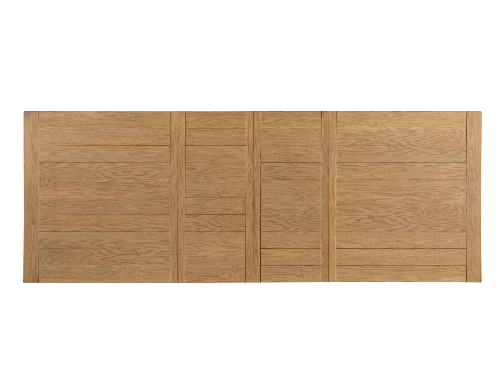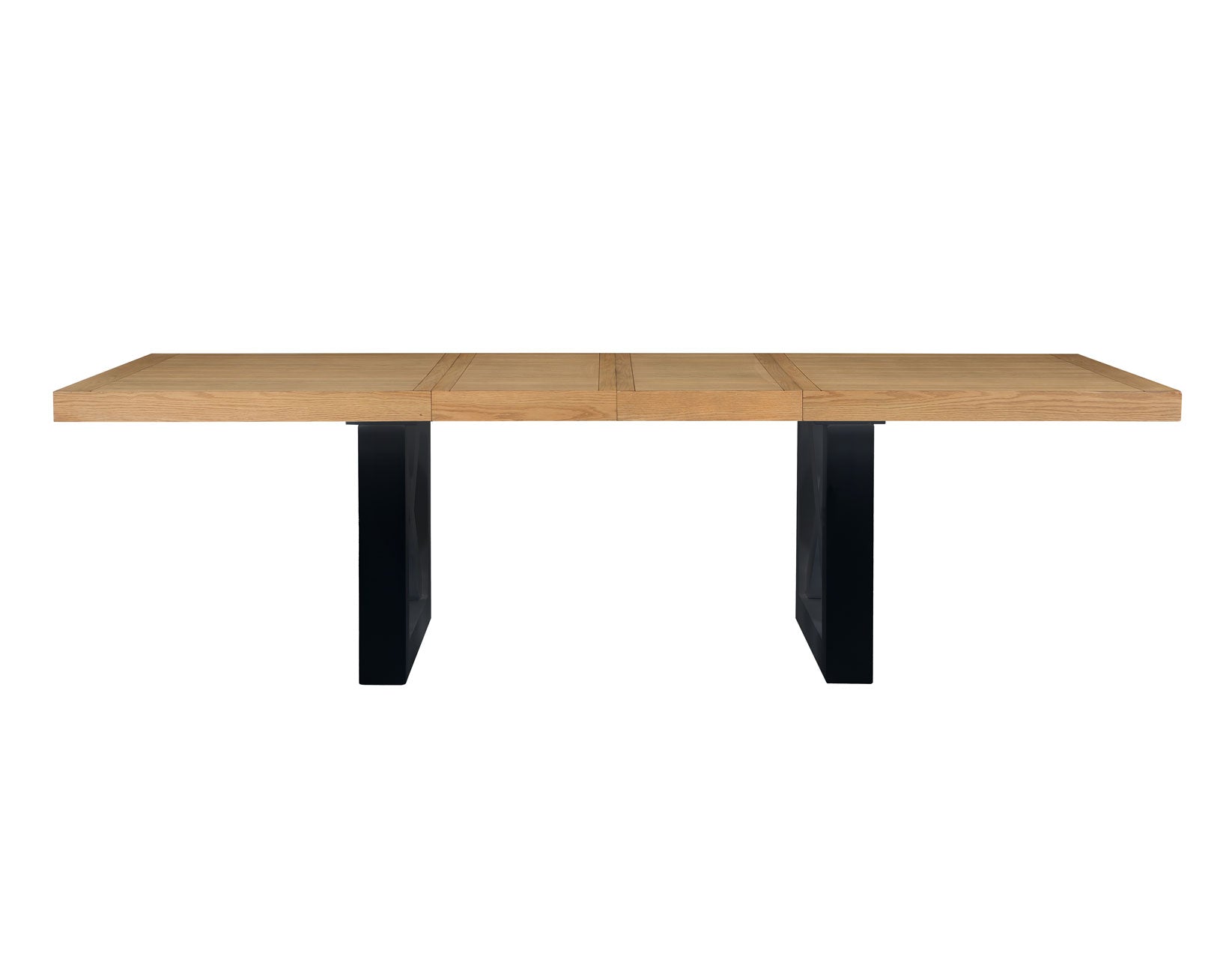 Large scale and generous proportions define the silhouette of this instant Modern Farmhouse dining table classic. A naturally finished top highlights the character and grain of the oak veneers and complements the substantial but refined white double pedestal base. This 72-inch long table fits in most dining room but scales at an instant to 96 and 108-inches to seat up to 10 guests easily.